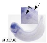 efna4 (ephrin A4) gene expression in X. laevis embryo, assayed whole-mount via in situ hybridization (WISH) at NF stage 35/36, lateral view anterior left, dorsal up. |