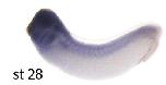 efna4 (ephrin A4) gene expression in X. laevis embryo, assayed whole-mount via situ hybridization (WISH) at NF stage 28, lateral view, anterior left, dorsal up. |