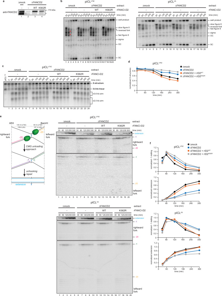 Fig. 3. FA pathway-dependent unhooking of colibactin-induced ICLs.a FANCD2 immunodepletion. The egg extracts used in the replication reactions shown in (b) (left) and (e) (top) were blotted for FANCD2. Asterisk indicates a non-specific band. b pICLc742 (left) and pICLclb (right) were replicated with [α−32P]dCTP in mock- or FANCD2-depleted egg extracts supplemented with rFANCI-FANCD2WT or rFANCI-FANCD2K562R, as indicated. Replication intermediates were analyzed as in Fig. 1d. SC supercoiled, OC open circular. Red arrowheads indicate pICLc742-specific repair intermediates; white arrowheads indicate reversed fork intermediates, which accumulate upon depletion of FANCD2. c pICLc742 was replicated in mock- or FANCD2-depleted egg extracts supplemented with rFANCI-FANCD2WT or rFANCI-FANCD2K562R, as indicated. Replication intermediates were analyzed by Southern blotting as in Fig. 1c. d Quantification of the Southern blot shown in (c). The persistence of pICLc742 X-shaped structures was quantified as the intensity of X-shaped structures relative to the combined intensities of X-shaped structures (X) and 5.6 kb linear species (L; X/X + L). e Left, schematic of nascent leading strand stall and extension products generated during ICL repair by the FA pathway, as in Fig. 1f. Right, nascent DNA strands from the pICLc742 (top) and pICLclb (bottom) replication reactions shown in (b) were digested with AflIII and BamHI and analyzed as in Fig. 1f. f Quantification of the −1 stall and strand extension products shown in (e). The intensities of rightward fork −1 stall products (top) or extension products (bottom) were normalized to maximum −1 stall or extension product intensity, respectively, across all samples. |