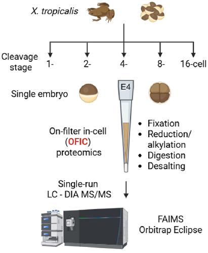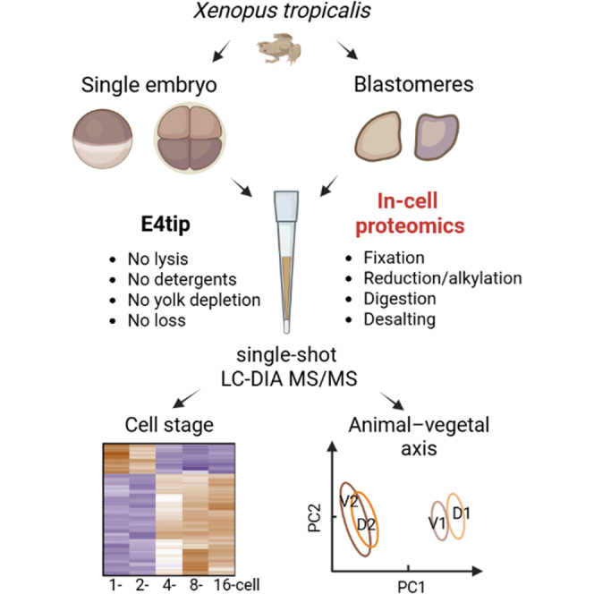 Early embryonic development requires tightly regulated molecular programs to coordinate cell division, fate specification, and spatial patterning. While transcriptomic profiling has been widely performed, proteomic analyses of early vertebrate embryos remain limited owing to technical challenges in embryonic sample preparation. Here, we present an "in-cell proteomics" strategy, which bypasses cell lysis and yolk depletion, processes individual embryos directly in functionalized filter devices, and generates mass spectrometry (MS)-friendly samples in an extremely robust and streamlined manner. This single-vessel approach minimizes sample loss and technical variation, offering a highly sensitive and accurate alternative to low-input and low-cell quantitative proteomics. Coupled with field asymmetric ion mobility spectrometry and single-shot data-independent acquisition MS workflow, this approach enabled us to consistently quantify ∼6200 proteins from a single Xenopus tropicalis embryo, representing the deepest proteomic coverage of early X. tropicalis developmental stages reported to date. Investigation of the temporal proteomes across five cleavage stages (from 1- to 16-cell stages) revealed a drastic proteomic shift between 2- and 4-cell stages, followed by more gradual transitions thereafter. Spatial analysis of dissected 8-cell blastomeres uncovered pronounced molecular asymmetry along the animal-vegetal axis, whereas dorsal-ventral differences were minimal. This study establishes a novel in-cell proteomics technology in conjunction with field asymmetric ion mobility spectrometry and data-independent acquisition MS as a robust platform for high-resolution, low-input developmental proteomics analysis and provides a comprehensive spatiotemporal protein atlas for early X. tropicalis embryos.