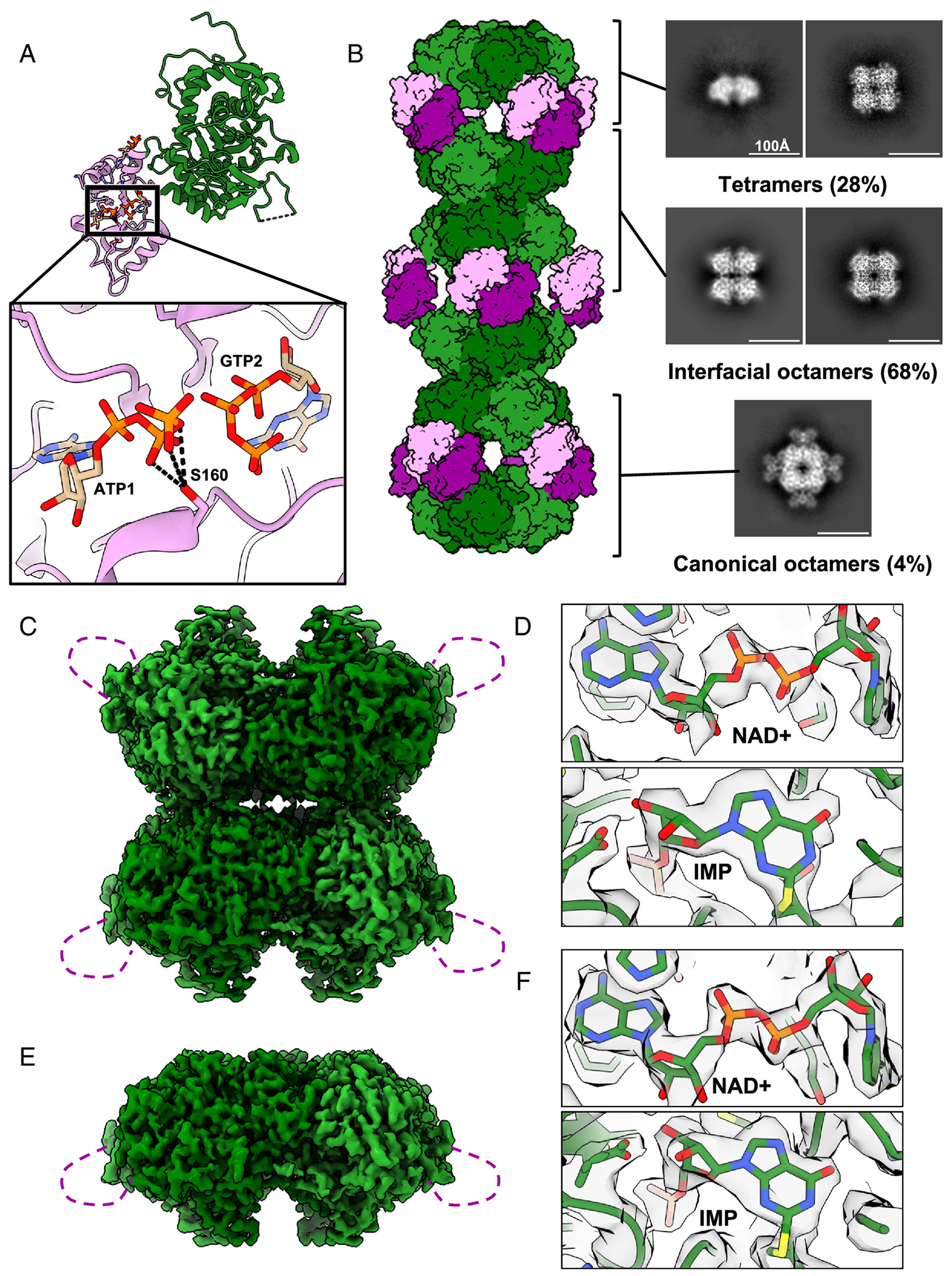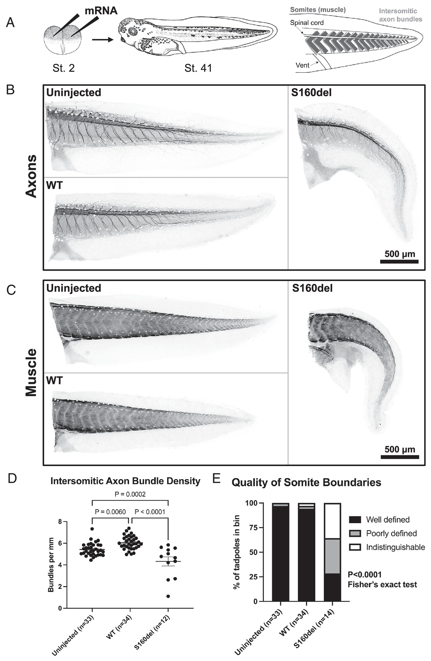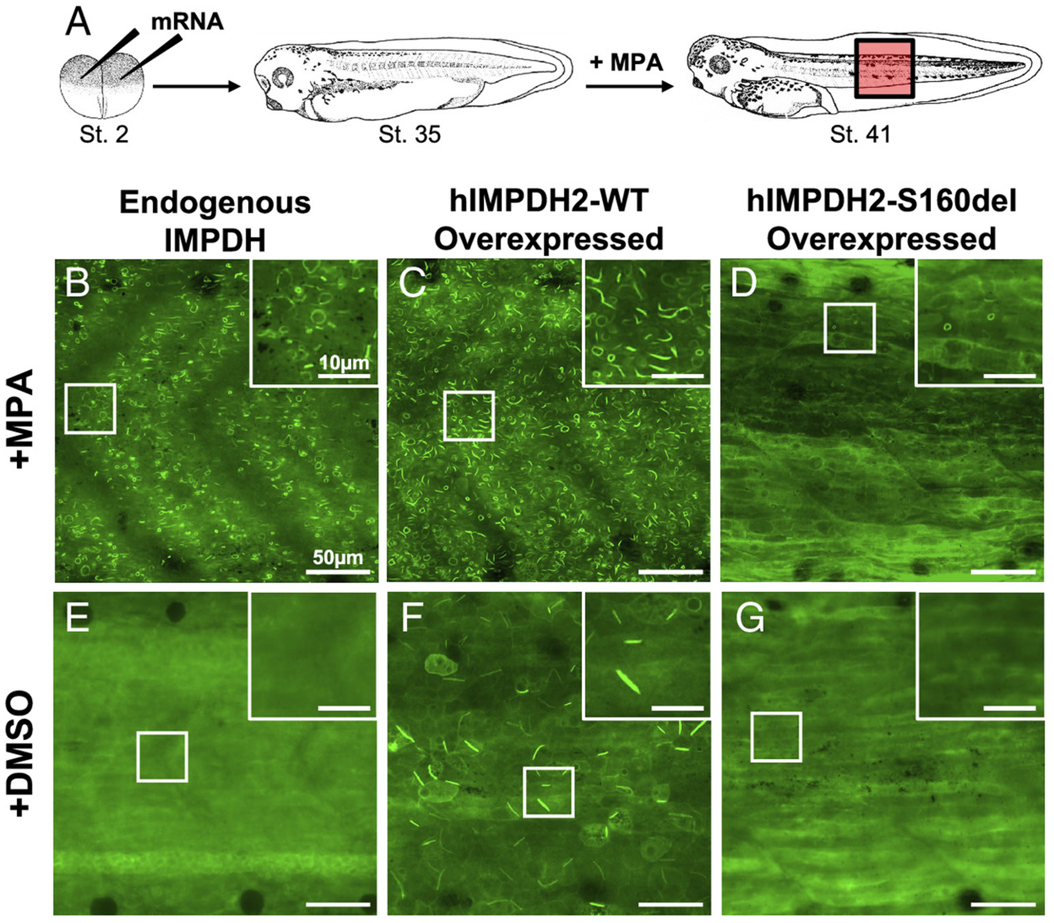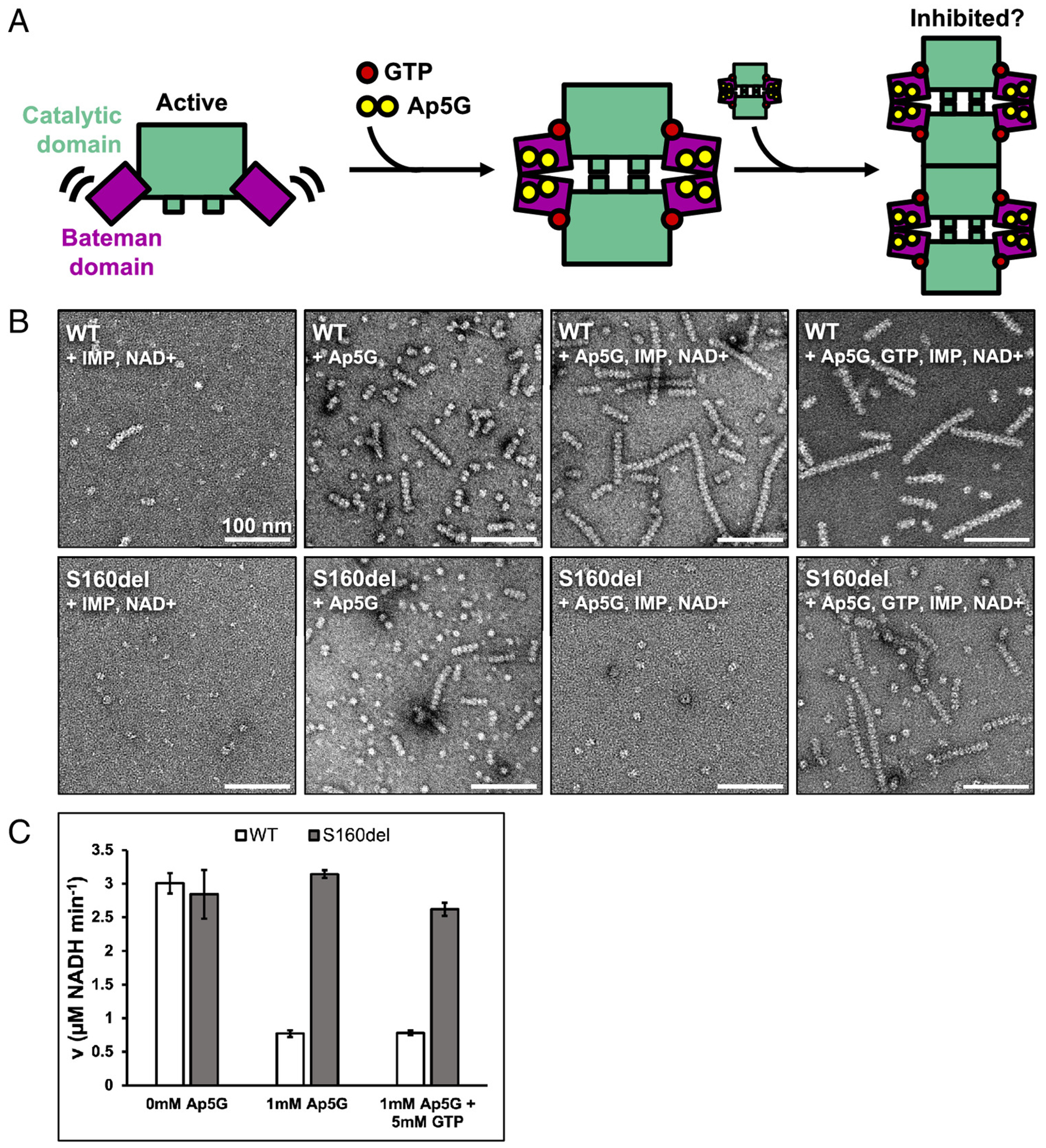 IMP dehydrogenase (IMPDH) controls a key regulatory node in purine biosynthesis. Gain-of-function mutations in human IMPDH2 are associated with neurodevelopmental disorders and neuromuscular symptoms including dystonia, but the developmental mechanisms underlying these defects are unknown. We previously showed that these mutants are insensitive to GTP inhibition and hypothesized that their hyperactivity would affect nucleotide metabolism in vivo. Here, we characterize the metabolic and developmental consequences of the neurodevelopmental disorder-associated IMPDH2 mutant, S160del, in Xenopus tropicalis. We show that expressing S160del but not WT human IMPDH2 disrupts purine pools and somite organization in the developing tadpole. We also show that S160del disrupts in vivo IMPDH filament assembly, a well-described IMPDH regulatory mechanism. Cryo-EM structures show that S160del disrupts filament assembly by destabilizing the dimerization of regulatory Bateman domains. Dimerization of Bateman domains and subsequent filament formation can be restored with a high affinity ligand, but this does not restore sensitivity to GTP inhibition, suggesting S160del also disrupts allostery of IMPDH2 filaments. This work demonstrates that the structural effects of patient IMPDH2 variants can cause disruptions both to nucleotide levels and to the normal development of sensorimotor structures, helping us better understand the physiological basis of disease in these patients.