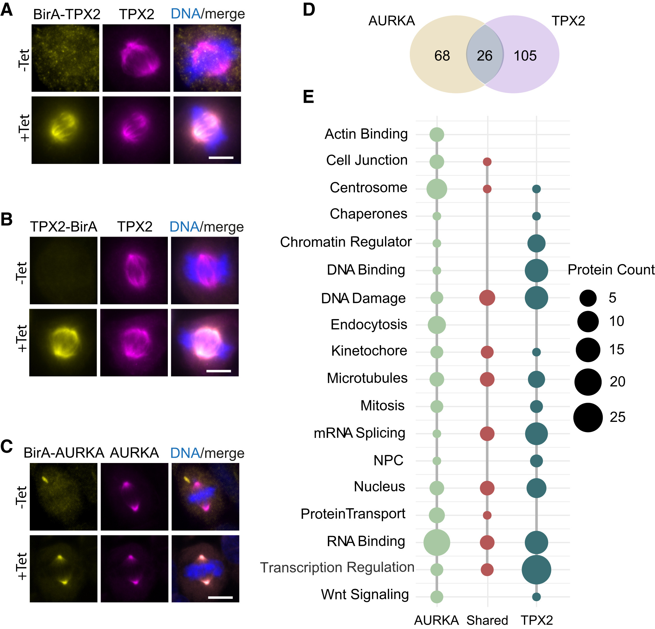 (A–C) Representative images of stable TREX-293 cells showing the localization of BirA∗-TPX2, TPX2-BirA∗, and BirA∗-AURKA. Cells were stained with anti-BirA (yellow), anti-TPX2/anti-AURKA (magenta), and DNA (blue). Tetracycline (±Tet) induces ectopic protein expression. Scale bars, 10 μm.