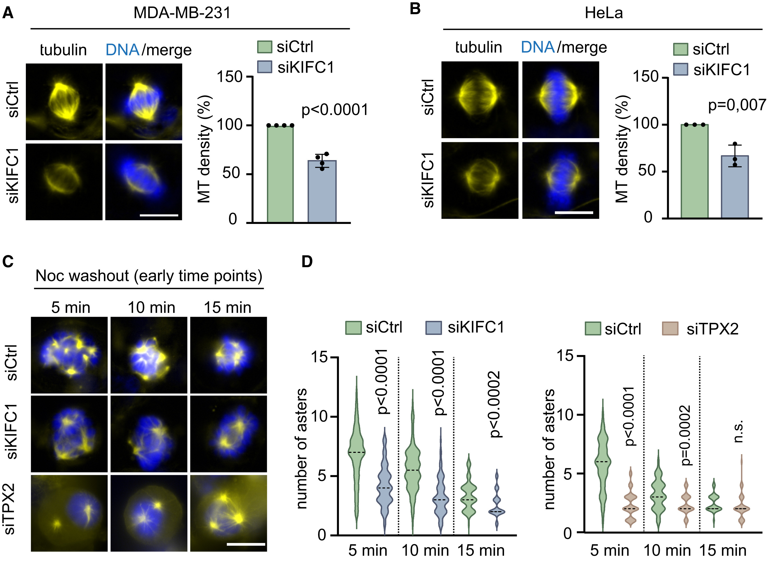 (C) Control (siCtrl), KIFC1-silenced (siKIFC1) and TPX2-silenced (siTPX2) mitotic HeLa cells after nocodazole washout. Tubulin (yellow) and DNA (blue). Scale bar, 10 μm.