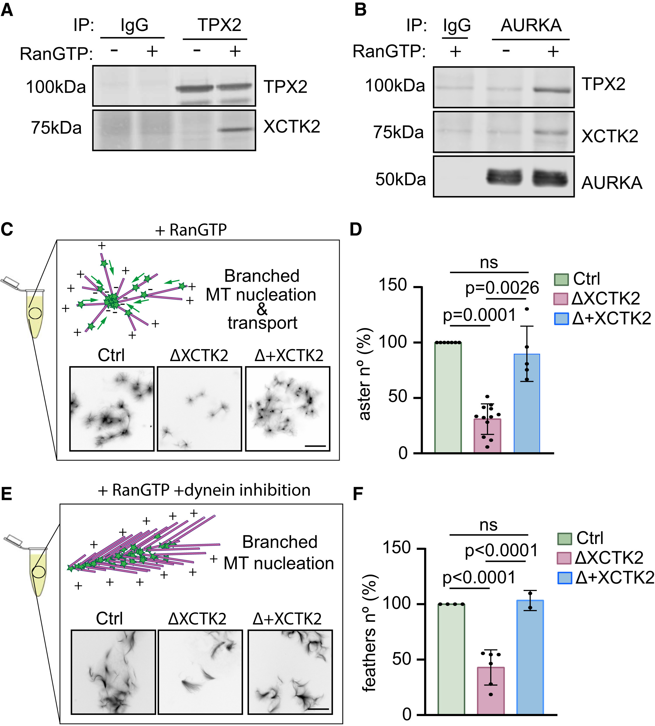 (A and B) Control (IgG), TPX2, and AURKA immunoprecipitation (IP) from egg extracts incubated or not with RanGTP.