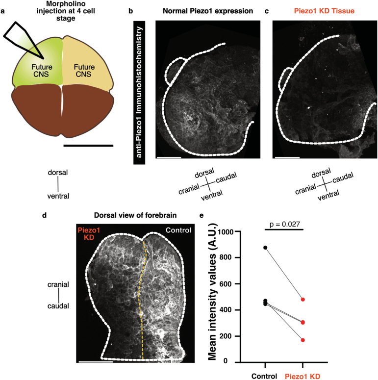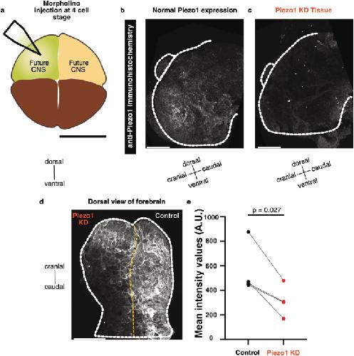 Extended Data Fig. 1. Downregulation of Piezo1 in half of the developing neuroepithelium.a, Schematic. At the 4-cell stage, translation-blocking morpholinos were injected into one of the two dorsal (usually less pigmented) blastomeres, which contribute to the formation of the nervous system. Scale bar: 600 µm. b-d, Immunofluorescence images of Xenopus laevis brains at stage 40. The dashed white outlines depict the boundaries of the brain tissue. Scale bars: 100 µm. b-c, Piezo1 expression patterns in neuroepithelium (lateral view) arising from the b, uninjected blastomere and c, the blastomere injected with translation-blocking Piezo1 morpholino, resulting in Piezo1 knockdown (KD). d, Dorsal view of Piezo1 expression in the developing neuroepithelium showing both the injected (Piezo1 KD) and the uninjected (Control) hemispheres. The dashed yellow line represents the midline. e, Piezo1 morpholino injection into one dorsal blastomere led to a significant decrease in Piezo1 expression in one half of the developing neuroepithelium. The graph represents the paired (Control vs Piezo1 KD) mean intensity values of the developing telencephalon. Each point represents an embryo (N = 4). Data was assessed with a two tailed ratio paired t-test; p-value indicated in the figure. KD: knockdown. |