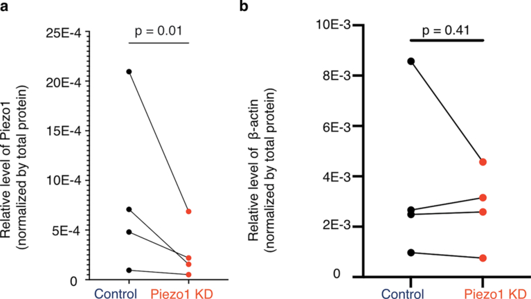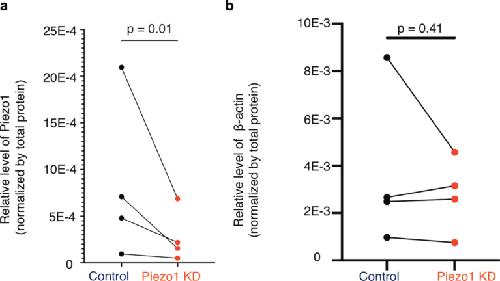 Extended Data Fig. 3. Quantification of Western blots.Downregulating Piezo1 led to a significant decrease in the expression of Piezo1 protein a, but not of β-actin b. Representative Western blot images are shown in Fig. 2k. Data were normalised by the total protein concentration. Each point represents the mean of a biological replicate (N = 4; two-tailed ratio paired t-test; p-values indicated). KD: knockdown. |