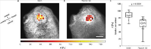 Extended Data Fig. 4. Piezo1 knockdown leads to softening of skin tissue.a, b, Heatmaps of AFM measurements for stage 31 a, SCR (control) and b, Piezo1 knockdown (KD) embryo skin tissue, overlaid on a fluorescence image of the GFP-containing injected constructs. Heatmaps are scaled to an apparent elastic modulus of 170 Pa; scale bar is 200 μm. c, Median skin tissue stiffness per animal in both conditions. Each dot corresponds to one animal; boxes span the first and third quartiles with a line at the median. The whiskers span the range of the data. Both groups were compared with a nested t-test, where AFM measurements were nested under animals, and animals under condition. N = 13 animals per condition; n = 3 - 23 stiffness measurements per animal. |