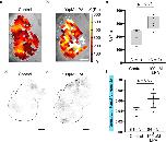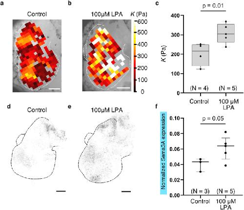 Extended Data Fig. 7. Lysophosphatidic acid (LPA) treatment results in increased tissue stiffness and Sema3A expression.a-b, Heatmaps of Stage 33/34 embryonic brains treated for 2-3 hours with a, 100 µM DMSO (control) or b, 100 µM LPA, overlaid on a brightfield image of the brain. The brain boundary is outlined by a white dotted line. Heat maps are scaled to an apparent elastic modulus K = 600 Pa. c, Median apparent elastic moduli K per animal in both conditions. Each dot in the graph corresponds to an animal measured. Boxes span the first and third quartiles with a line at the median, whiskers span the range of the data. Groups were compared with a nested t-test, where AFM measurements were nested under animals, and animals under condition (p-value indicated). d-e, Sema3A RNA expression in embryonic brains treated for 6 hours with d, 100 µM DMSO (control) or e, 100 µM LPA. The brain boundary is outlined by a black dotted line. f, Normalized Sema3A mRNA expression levels (two tailed unpaired t-test with Welch’s correction; p-value indicated). Each dot corresponds to an embryo measured. Scale bars: 100 µm. N: number of embryos measured. LPA: lysophosphatidic acid. |