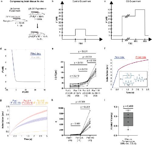 Extended Data Fig. 8. Uniaxial compression leads to brain tissue stiffening in vivo.a-c, Schematic of the experiment. In the experiment mimicking the control condition (a(i), b), the tissue was indented with F = 10 nN for a duration of t = 3 s. In the experiment mimicking the compression stiffening (CS) experiments (a(ii), c) (Fig. 6), the tissue was first exposed to a constant force of F = 30 nN for 900 seconds (ii-A), and subsequently, without retracting the cantilever, it was indented further by an additional F = 10 nN for 3 seconds (ii-B). d, Example of a linear fit (blue) to a force–distance (F-d) curve (grey) used to calculate the stiffness k (see Methods). e, Plot of the stiffnesses obtained by fitting F = kd + c through the last 8 nN of the F-d curves of indentations (i), (ii-A), and (ii-B), as well as through the range of 2 nN – 10 nN of indentation (ii-A). The stiffness of the tissue was similar during the first 10 nN indentation in approaches (i) and (ii-A), as expected. However, already during the application of the compressive force in approach (ii-A), tissue stiffness increased immediately. k was significantly smaller at the beginning (2-10 nN) of the indentation than at its end (22-30 nN indentation) (median k2-10 nN = 3.0 nN/µm vs. k22-30 nN = 6.2 nN/µm). When probing tissue stiffness after compression for 900 s (ii-B), k increased even further (median kii-B = 16.9 nN/µm). These data confirmed that uniaxial compression leads to tissue stiffening18