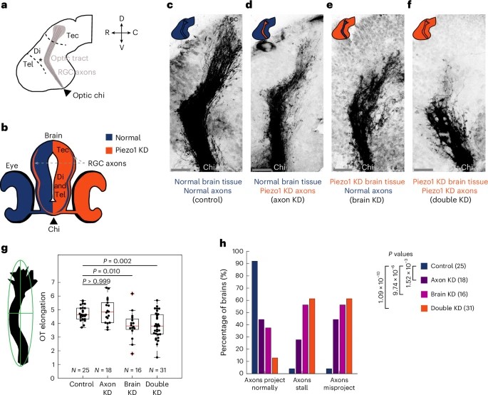 Fig. 1: RGC axon pathfinding in vivo requires cell-intrinsic and cell-extrinsic Piezo1 signalling. a, Schematic of the lateral view of a stage 40 Xenopus brain with orientation guides for rostral–caudal (R, C) and dorsal–ventral (D, V) axes. RGC axons grow from the optic chiasm towards the optic tectum along a stereotypic path (the optic tract), turning caudally at the mid-diencephalon (marked by an asterisk). b, Schematic cross-section of a Xenopus brain and retinae when Piezo1 is downregulated unilaterally in the nervous system. RGC axons cross the midline at the optic chiasm and grow across the contralateral brain surface. Normal Piezo1 levels are indicated in blue while Piezo1 depletion is shown in red. Piezo1-depleted axons grow across brain tissue with normal Piezo1 levels and vice versa. c–f, Images of RGC axon growth in vivo in control (c), Piezo1-depleted axons (d), Piezo1-depleted surrounding brain tissue (parenchyma) (e), and both axons and brain tissue depleted of Piezo1 (f). Scale bars, 50 μm. g, Optic tract (OT) elongation. Schematic representation of the fitted ellipse used to determine optic tract elongation, expressed as the ratio of long to short axes. Quantification for the indicated conditions (Kruskal–Wallis test, P < 0.0001, followed by Dunn’s post hoc test; adjusted P-values indicated). Each point represents a brain. Boxes show median, first and third quartiles; whiskers show the spread of data; ‘+’ indicate outliers. N denotes the number of animals. h, Scoring of brains displaying aberrant phenotypes. Quantification of embryos showing normal, stalling or misprojection defects after Piezo1 knockdown in axons, brain tissue or both (two-tailed chi-squared test, P = 1.014 × 10−8, followed by Fisher’s exact post hoc tests; number of animals indicated in parentheses) (Extended Data Fig. 2). Data are pooled from a minimum of three independent experiments. chi, chiasm; di, diencephalon; KD, knockdown; tec, tectum; tel, telencephalon.