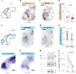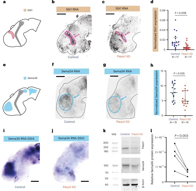 a, Schematic representation of the expression pattern of the diffusive chemical guidance cue, Slit1. b,c, Representative HCR-FISH images of Slit1 expression in control (b) and Piezo1 knockdown (c) brains. d, Quantification of Slit1 mRNA expression (two-tailed unpaired t-test with Welch’s correction; P value indicated). e, Schematic of the Sema3A expression pattern. f,g, Representative HCR-FISH images of Sema3A expression in control (f) and Piezo1 knockdown (g) brains. h, Quantification of normalized Sema3A expression (two-tailed unpaired t-test with Welch’s correction; P value indicated). i,j, In situ hybridization of Sema3A mRNA expression in control (i) and Piezo1 knockdown (j) brains. k, Western blot of Piezo1, Sema3A and β-actin protein expression in control and Piezo1-depleted brains. l, Western blot quantification (N = 4, normalized to total protein, each point indicates the mean value of a biological replicate; two-tailed ratio paired t-test; P value indicated). Each point in d,h represents an embryo; bars indicate lower quartile, median and upper quartiles. N, number of animals. Scale bars, 100 μm. ISH, in situ hybridization. |