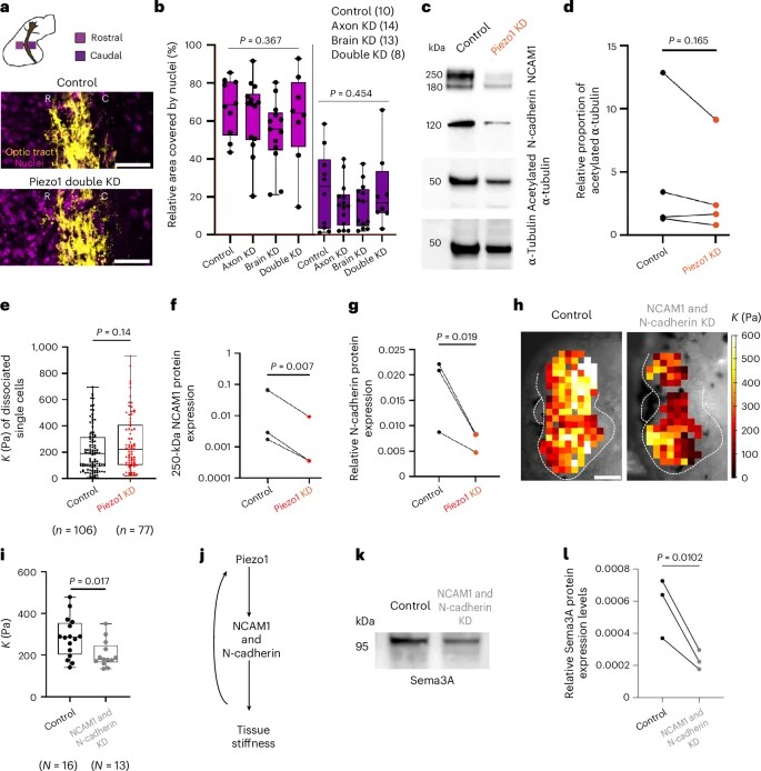 a,b, Local cell body densities. a, Representative images of nuclei (DAPI, magenta) in brain tissue rostral (R) and caudal (C) to the optic tract (DiI, yellow) in stage 40 Xenopus embryos. Scale bars, 50 μm. b, Relative nuclear area rostral and caudal to the optic tract (two independent experiments; one-way ANOVA). c, Western blot of NCAM1, N-cadherin, acetylated α-tubulin and total α-tubulin in control and Piezo1-depleted brains. d, Western blot quantification (N = 4) of relative proportion of acetylated α tubulin (ratio of acetylated α-tubulin/total α-tubulin). e, Quantification of the reduced apparent elastic modulus K of dissociated brain cells (two-tailed Mann–Whitney test). Each point represents a single cell. f,g, Western blot quantification (N = 3; normalized to total protein) of NCAM1 (250 kDa) (f) and N-cadherin (g). h, AFM-based stiffness maps overlaid on bright-field images of control and NCAM1- and N-cadherin-depleted brains. Scale bar, 100 µm. i, Tissue stiffness quantification (nested t-test). Each point represents the median K of an embryo. j, Schematic illustrating the mechanism linking Piezo1 to tissue stiffness: Piezo1 regulates major cell–cell adhesion proteins (N-cadherin, NCAM1), which in turn regulate tissue stiffness. k, Western blot of Sema3A protein expression in control and NCAM1 and N-cadherin-depleted brains. l, Quantification of Sema3A protein expression (N = 3; normalized to total protein). d,f,g,l, show two-tailed ratio paired t-tests; P-values are indicated. In b,e,i boxes show first and third quartiles with median lines; whiskers show the spread of data. Double KD, optic tract and brain tissue depleted of Piezo1. |