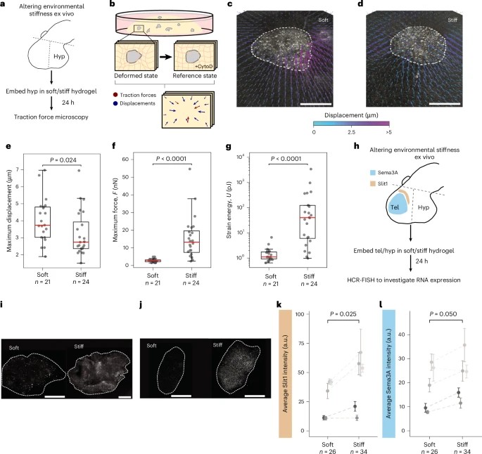 a,b, Schematic of the experimental design: hypothalamic (hyp) explants were dissected from Xenopus brains and embedded in collagen hydrogels for 24 h (a); the matrix was imaged in a deformed and a reference state (induced by tissue relaxation using cytochalasin D (CytoD)); deformations were quantified and forces calculated (b). c,d, Representative displacement fields for explants embedded in soft (c) and stiff (d) hydrogels. Displacements are colour-coded; white dashed lines indicate tissue boundaries. Scale bars, 100 µm. e, Maximum matrix displacement. f, Maximum traction force, F. g, The strain energy U, which is a measure of the work the tissue as a whole committed to deform the substrate. In e–g, each point represents an explant; boxes show first and third quartiles with median lines; whiskers extend to 1.5× the interquartile range (two-tailed Mann–Whitney U-test; P value indicated, N = 3). h, Schematic for perturbing environmental stiffness ex vivo. Telencephalon and hypothalamus (boundaries indicated in dashed lines) were embedded in soft or stiff 3D substrates. Slit1 and Sema3A mRNA expression were quantified by HCR-FISH after 24 h. i,j, Representative images of Slit1 (i) and Sema3A (j) expression in hypothalamic tissue in soft (left) and stiff (right) substrates. For guidance cue expression in the telencephalon, see Extended Data Fig. 6. Scale bars, 75 µm. k–l, Quantification of Slit1 (k) and Sema3A (l) mRNA expression. Points represent means ± standard errors of biological replicates (two-tailed ratio paired t-tests); n denotes number of tissue explants from five independent experiments. a.u., arbitrary units. |