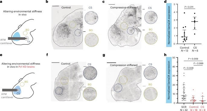 Fig. 6: Stiffening brain tissue in vivo triggers Piezo1-dependent ectopic Sema3A expression.