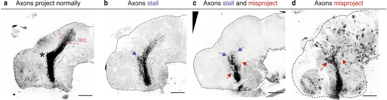 Extended Data Fig. 2. RGC axon growth phenotypes and guidance defects in the developing Xenopus brain.a, Normal RGC axonal projections in the brain of a stage 40 Xenopus laevis embryo. RGC axons form a bundle, turn in the mid-diencephalon (marked with ‘*’), and arrive at the optic tectum (tec). b, Representative image of a brain showing stalling of some RGC axons (purple arrow) before others turn caudally in the mid-diencephalon. c, Representative image of a brain showing RGC axon stalling (purple arrows) and splaying (that is, unbundling / defasciculation), leading to misprojections (red arrows). d, Representative image of a brain showing RGC axons unbundling and misprojecting (red arrows). Scale bars: 100μm. RGC: retinal ganglion cell. |