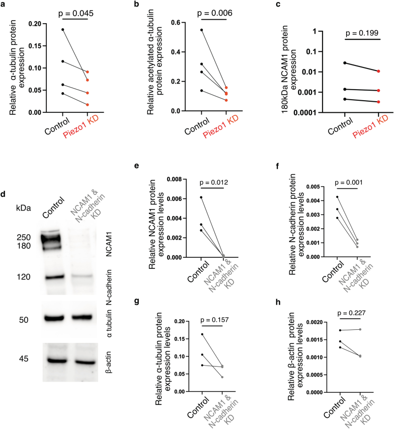 Extended Data Fig. 5. Cytoskeletal changes following genetic perturbations.a-c, Western blot quantification of a, α-tubulin, b, acetylated α-tubulin and c, 180 kDa NCAM1 for Western blot images shown in Fig. 4a. Data normalised by the total protein concentration; two-tailed ratio paired t-tests, p-values indicated. Each point represents the mean of a biological replicate (N = 4). d, Western blot images of NCAM1, N-cadherin, α-tubulin and β-actin expression in control and in NCAM1/N-cadherin double-knockdown samples (KD). e-h, Western blot quantification of morpholino-mediated knockdown of NCAM1 and N-cadherin for e, NCAM1, f, N-cadherin, g, α-tubulin, and h, β-actin. Data normalised by the total protein concentration; two-tailed ratio paired t-tests, p-values indicated. Each point represents the mean of a biological replicate (N = 3). KD: knockdown. |