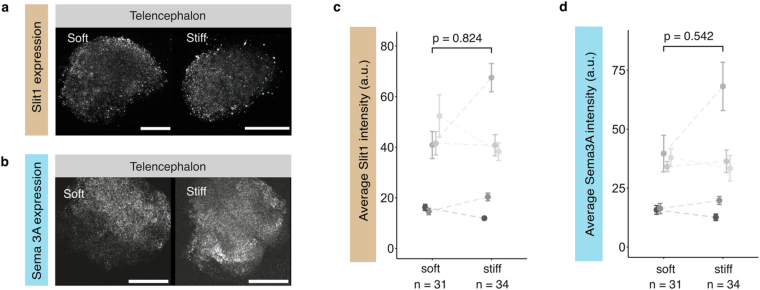 Extended Data Fig. 6. Chemical cue expression in the telencephalon is independent of substrate stiffness ex vivo.a-b, HCR-FISH images of a, Slit1 and b, Sema3A expression in telencephalic tissue after 24 hours in soft (left) and stiff (right) substrates (two-tailed ratio paired t-test, p-values indicated). Scale bars: 100 µm. c-d, Quantification of c, Slit1 and d, Sema3A mRNA expression. Individual points represent means with standard errors of each biological replicate. a.u.: arbitrary units. n denotes number of tissue explants from 5 independent experiments. |