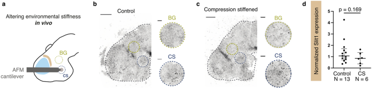 Extended Data Fig. 9. Compression-stiffening of hypothalamic tissue in vivo does not significantly alter Slit1 expression.a, Schematic representation of the experimental setup for compression stiffening brains in vivo. b-c, Slit1 expression in b, control and c, compression-stiffened brains. Dashed circles indicate compression-stiffened (CS) and background (BG) regions used for analysis. The insets show magnified view of analysis areas. Scale bars: 100 μm for whole brain images, 20 μm for insets. d, Normalised Slit1 expression levels (calculated by measuring the ratio of the total area covered by the signal in the CS region to the mean area covered by the signal in the BG regions). Individual dots represent the normalised expression levels in each embryo (Ncontrol = 13 and NCS = 6). The lines indicate interquartile ranges and the median. Two-tailed unpaired t-test with Welch’s correction was used for statistical analysis, the p-value is indicated. BG: background, CS: compression stiffened. |