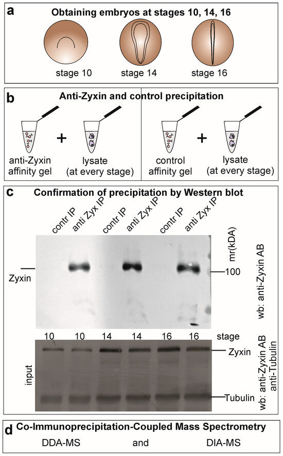Figure 1. Stage-resolved analysis of the Zyxin interactome in Xenopus laevis embryos. (a) Schematic of the three analyzed developmental stages: early gastrula (stage 10), early neurula (stage 14), and late neural fold (stage 16). (b) Experimental workflow. Endogenous Zyxin complexes were isolated by co-immunoprecipitation (co-IP) from embryo lysates using a validated antibody cocktail and analyzed by quantitative mass spectrometry. (c) Western blot validation of co-IP specificity. Zyxin was efficiently and specifically immunoprecipitated across all stages. Non-specific rabbit IgG served as a negative control. Lysate inputs are shown as a reference. (d) Complementary mass spectrometry strategies: Data-Dependent Acquisition (DDA) for deep interactome discovery and Data-Independent Acquisition (DIA) for accurate, label-free quantification across stages.