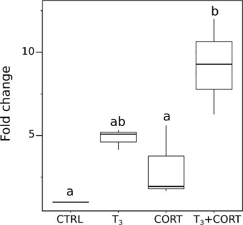 Figure S1. Measure of klf9 gene expression by RT-qPCR. Box plots represent the expression fold change (n = 10/treatment condition). Letters a and b indicate significant differences between the group means based on a Mann-Whitney test. CTRL = control; T3 = 3,3',5-triiodothyronine; CORT = corticosterone; T3+CORT = 3,3',5-triiodothyronine + corticosterone. |