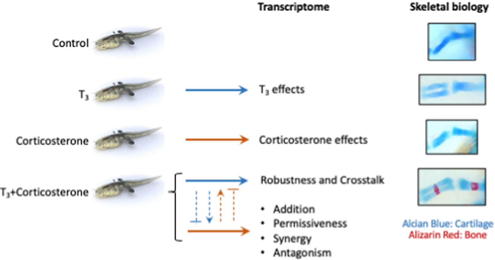 Fig. 6. T3 and CORT cross-talk affects skeletal development during metamorphosis. A) Schematic diagram of treatment with T3 or/and CORT for phenotypic analysis. B) CORT treatment does not affect limb size. Bone surface was used as a proxy to follow limb size for each treatment indicated in panel A. Box plots represent changes of bone surface (n = 4/treatment condition), and box plots with the same letter are not significantly different (p < 0.05; Mann-Whitney test). C) T3 and CORT cotreatment accelerate bone formation. Skeletal preparation (Alcian/Alizarin) of the same samples (left panel). Cartilage is stained with alcian blue and bone with alizarin red. Morphology of hindlimb buds 24 h after a 24 h treatment (right panel). D) T3 induced bone formation increase with CORT treatment. Measurement of bone surface area to cartilage surface area ratio from data presented in panel C. Histograms represent the bone cartilage ratio (n = 4/treatment condition), and histograms with the same letter are not significantly different (p < 0.05; Mann-Whitney test). E) Bone structures appear just before metamorphic climax. Skeletal preparation (Alcian/Alizarin) of natural metamorphosis samples showing developmental stages from NF55 to NF58. Bone structures normally start to appear at stage NF57 and are clearly present at stage NF58. Cartilage is stained with alcian blue and bone with alizarin red. F) Schematic diagram of treatment with CORT for 24h at two stages of natural metamorphosis: NF 59 before climax and NF61 at metamorphic climax. Phenotypic analysis was done after completion of metamorphosis stage NF66. G) CORT treatment before climax leads to smaller limb length. Measurement of froglet hindlimb lengths following treatment protocol presented in panel F. Box plots represent the limb length (n = 23 and n = 21 for respectively control and CORT condition), and box plots with the same letter are not significantly different (p < 0.05; Mann-Whitney test). CTRL = control; T3 = 3,3',5-triiodothyronine; CORT = corticosterone; T3+CORT = 3,3',5-triiodothyronine + corticosterone. (For interpretation of the references to color in this figure legend, the reader is referred to the Web version of this article.) |