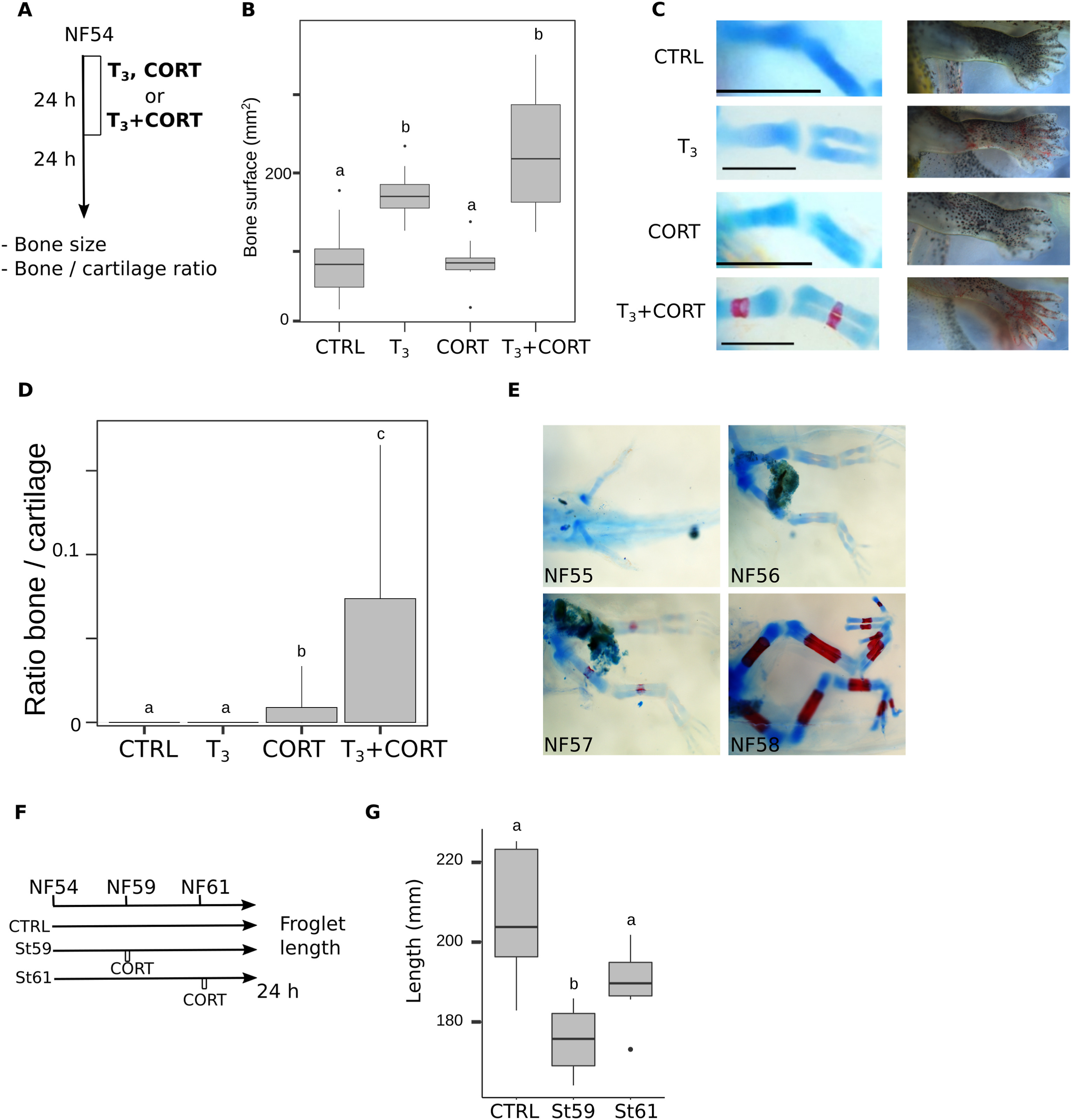 Fig. 6. T3 and CORT cross-talk affects skeletal development during metamorphosis. A) Schematic diagram of treatment with T3 or/and CORT for phenotypic analysis. B) CORT treatment does not affect limb size. Bone surface was used as a proxy to follow limb size for each treatment indicated in panel A. Box plots represent changes of bone surface (n = 4/treatment condition), and box plots with the same letter are not significantly different (p < 0.05; Mann-Whitney test). C) T3 and CORT cotreatment accelerate bone formation. Skeletal preparation (Alcian/Alizarin) of the same samples (left panel). Cartilage is stained with alcian blue and bone with alizarin red. Morphology of hindlimb buds 24 h after a 24 h treatment (right panel). D) T3 induced bone formation increase with CORT treatment. Measurement of bone surface area to cartilage surface area ratio from data presented in panel C. Histograms represent the bone cartilage ratio (n = 4/treatment condition), and histograms with the same letter are not significantly different (p < 0.05; Mann-Whitney test). E) Bone structures appear just before metamorphic climax. Skeletal preparation (Alcian/Alizarin) of natural metamorphosis samples showing developmental stages from NF55 to NF58. Bone structures normally start to appear at stage NF57 and are clearly present at stage NF58. Cartilage is stained with alcian blue and bone with alizarin red. F) Schematic diagram of treatment with CORT for 24h at two stages of natural metamorphosis: NF 59 before climax and NF61 at metamorphic climax. Phenotypic analysis was done after completion of metamorphosis stage NF66. G) CORT treatment before climax leads to smaller limb length. Measurement of froglet hindlimb lengths following treatment protocol presented in panel F. Box plots represent the limb length (n = 23 and n = 21 for respectively control and CORT condition), and box plots with the same letter are not significantly different (p < 0.05; Mann-Whitney test). CTRL = control; T3 = 3,3',5-triiodothyronine; CORT = corticosterone; T3+CORT = 3,3',5-triiodothyronine + corticosterone. (For interpretation of the references to color in this figure legend, the reader is referred to the Web version of this article.) |