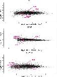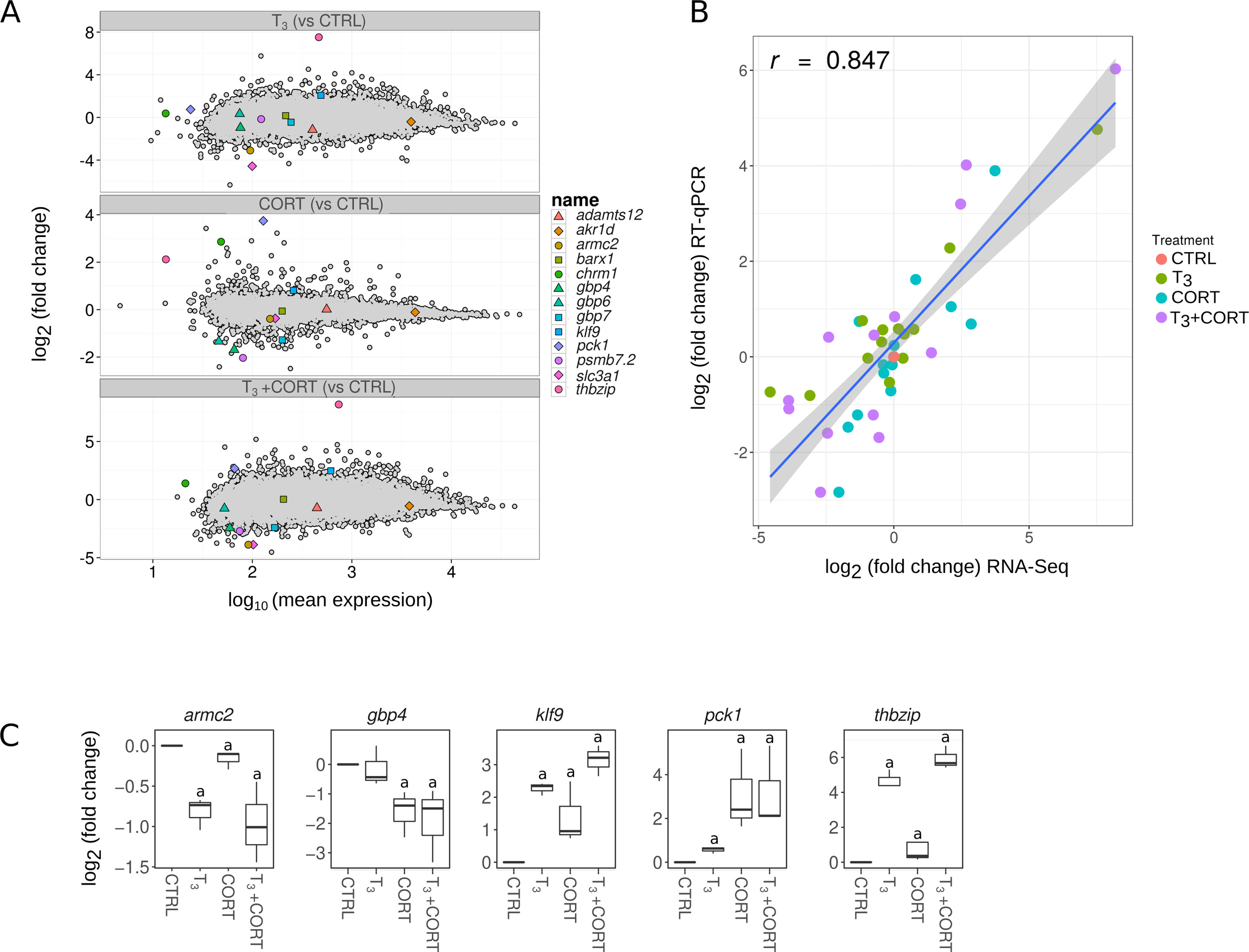 Figure S2. RT-qPCR validations of gene expression levels measured by RNA-Seq. Thirteen genes were chosen from RNA-Seq results over wide dynamic range of expression, as illustrated on the MA plots (A). Expression levels were measured by RT-qPCR and normalized using rpl8 as internal control, with three biological replicates. The relationship between fold changes (in log2 scale) measured by RT-qPCR and by RNA-Seq is shown in panel B. Expression profiles for 5 genes are presented in panel C. Box plots represent the log2 fold change (n = 10/treatment condition). Letters a and b indicate significant differences between the group means based on a Mann-Whitney test. CTRL = control; T3 = 3,3',5-triiodothyronine; CORT = corticosterone; T3+CORT = 3,3',5-triiodothyronine + corticosterone. |