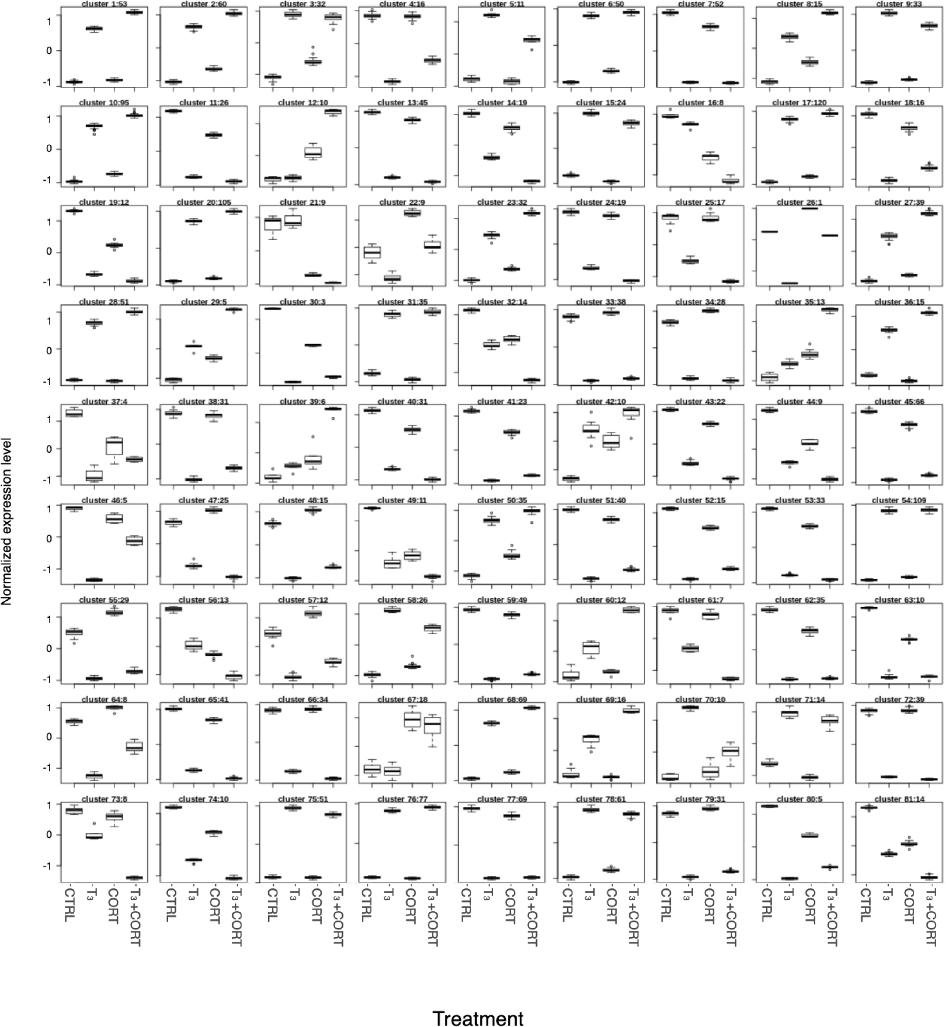 Figure S4. Expression profiles of T3, CORT and T3+CORT differentially expressed genes. Transcriptome analysis reveals 81 expressions profiles. For each gene, the expression level was adjusted to a variance of 1, and normalized by the mean expression level across all four conditions. Within each cluster, expression values are summarized by a box plot. Upper and lower “hinges” correspond to the first and third quartiles. The upper and lower whiskers extend from the hinge to respectively the highest or lowest value that is within 1.5 times the inter-quartile range of the hinge. Data beyond the end of the whiskers are outliers and plotted as points. The number of genes in each cluster is indicated after the cluster number. CTRL = control; T3 = 3,3',5-triiodothyronine; CORT = corticosterone; T3+CORT = 3,3',5-triiodothyronine + corticosterone. |