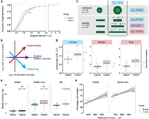 (F) Proportion of neuronal volume and surface area contributed by neurites. Diploid and triploid data were combined, smoothed with a linear model, and presented as the mean +/- 95% confidence interval. ns, not significant, recursive CUSUM test.37