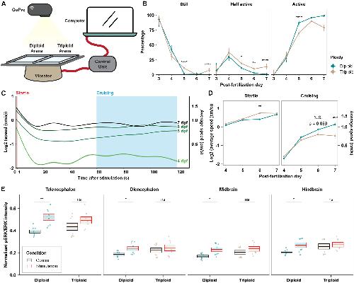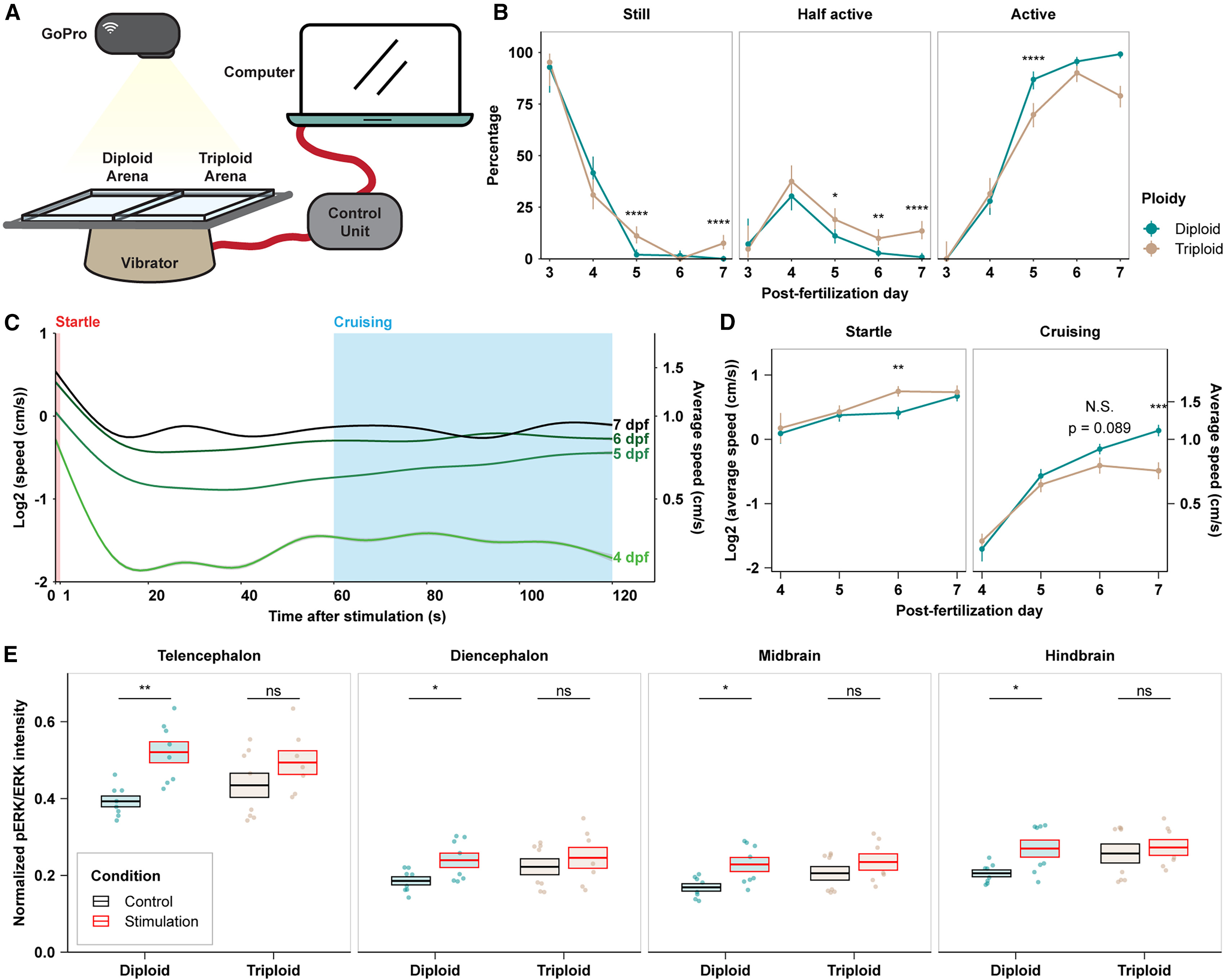 (E) Comparison of pERK/ERK intensity in 6-dpf tadpole brains before and after repetitive vibrator stimulation. Telencephalon and diencephalon make up the forebrain. Each dot represents one brain. The numbers of brains examined were 8 for the diploid control group, 8 for the diploid stimulation group, 8 for the triploid control group, and 7 for the triploid stimulation group. Brains were from two independent clutches. Crossbars denote mean +/- SEM. ∗p < 0.05 and ∗∗p < 0.01; ns, not significant; t test. See also Figure S8C for heatmaps corresponding to these data and Table S2 for detailed statistical analysis.