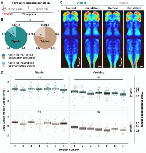 Figure 6 Neuron size and brain physiology differences produce distinct swimming behaviors in triploid tadpoles