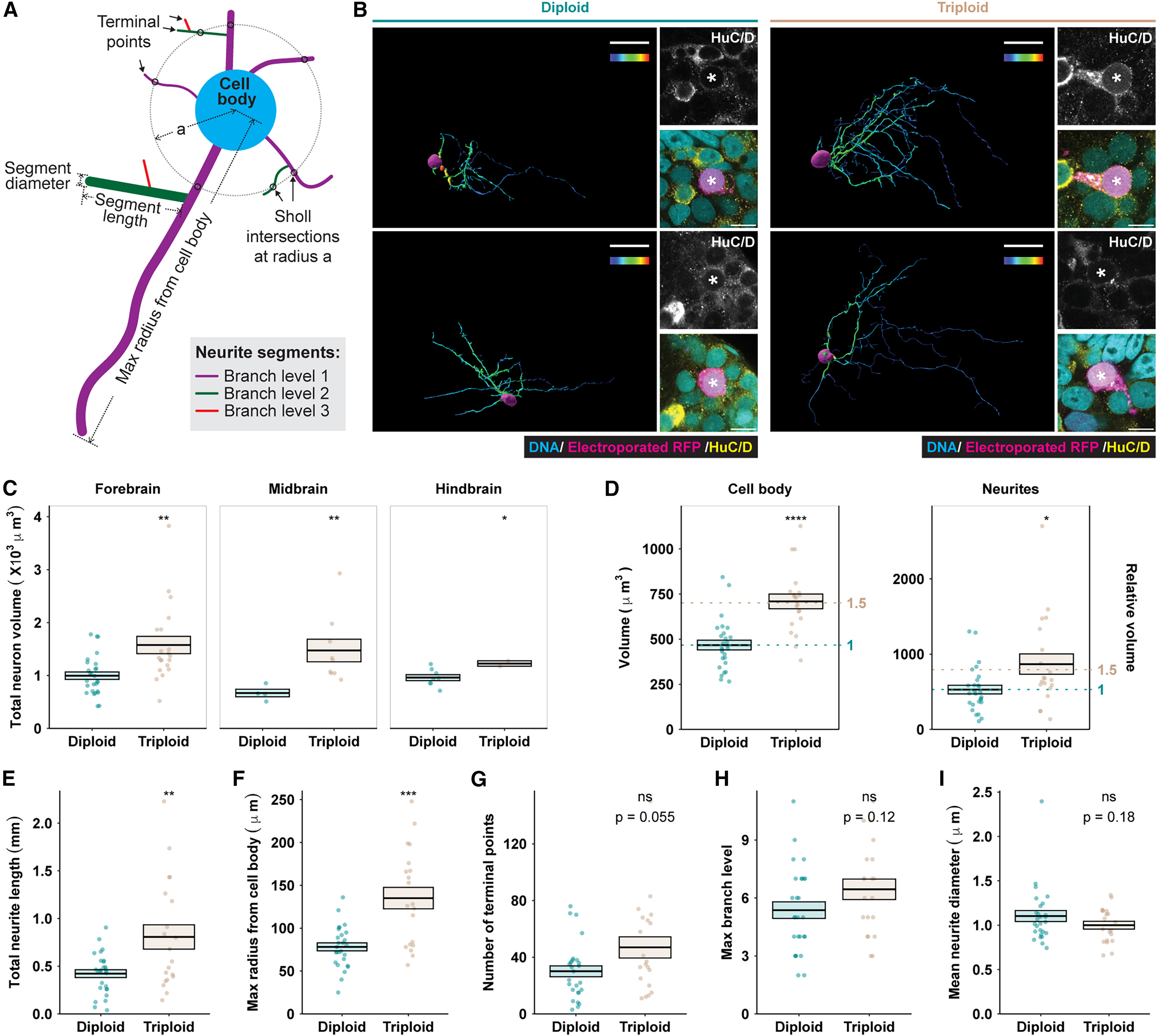 Figure 1 Triploid neurons are larger in volume and extend longer neurites