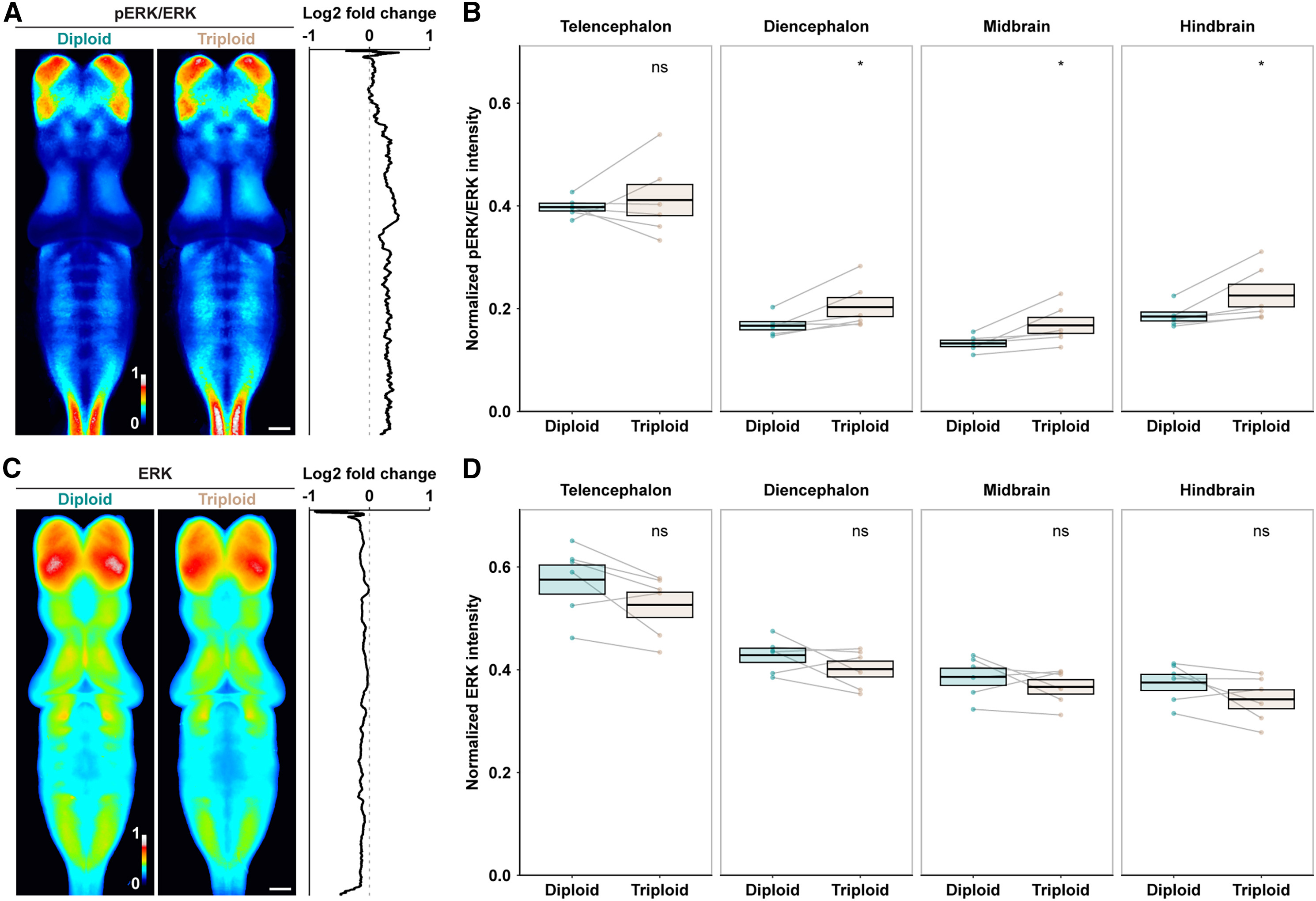 (C) Heatmap showing normalized, averaged ERK intensity of the same brains as in (A). Log2 fold changes (triploid/diploid) of ERK intensity along the y axis are plotted to the right. Scale bar, 100 μm.
