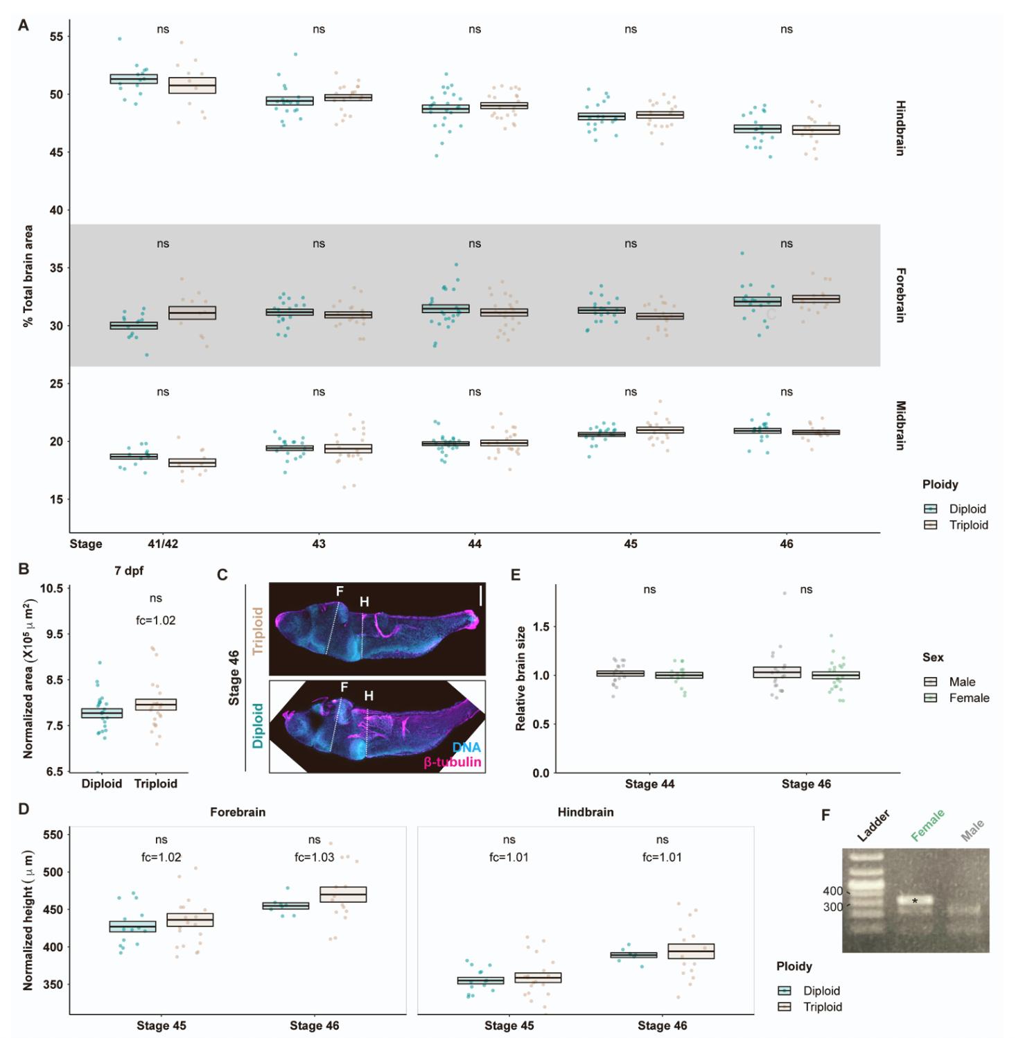 (A) Comparison of the proportion of the forebrain, midbrain, and hindbrain in diploid and triploid brains across multiple developmental stages. Numbers of diploid/triploid brains examined were 15/11 at stage 41/42, 18/20 at stage 43, 24/22 at stage 44, 19/18 at stage 45, and 18/15 at stage 46. Brains were from 3 independent clutches.