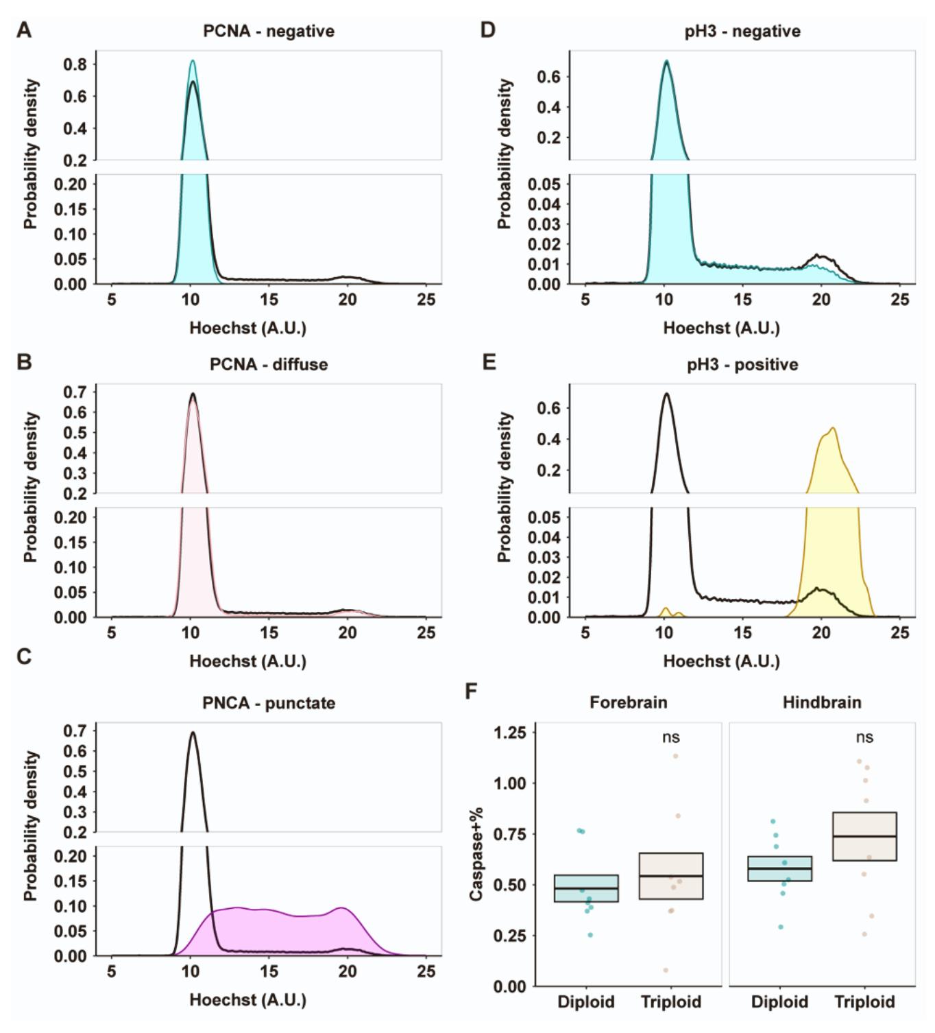(E and F) Probability density distribution of log10 PCNA level in representative diploid (E) and triploid (F) flow cytometry samples of dissociated brain cells at developmental stage 46. Gaussian distributions were used to fit the three populations as shown in (C). See also Figures S4A–S4C for DNA content distributions of the three PCNA populations.
