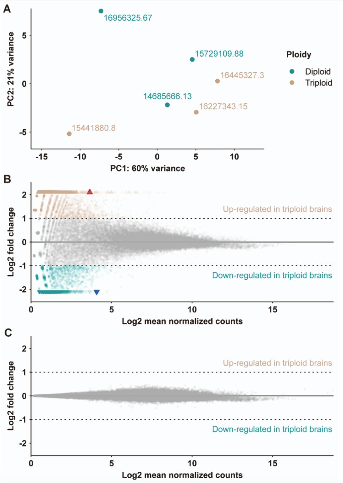 (B) Mean-Average (MA) plot showing log2 fold changes (triploid/diploid) of gene expression in tadpole brains