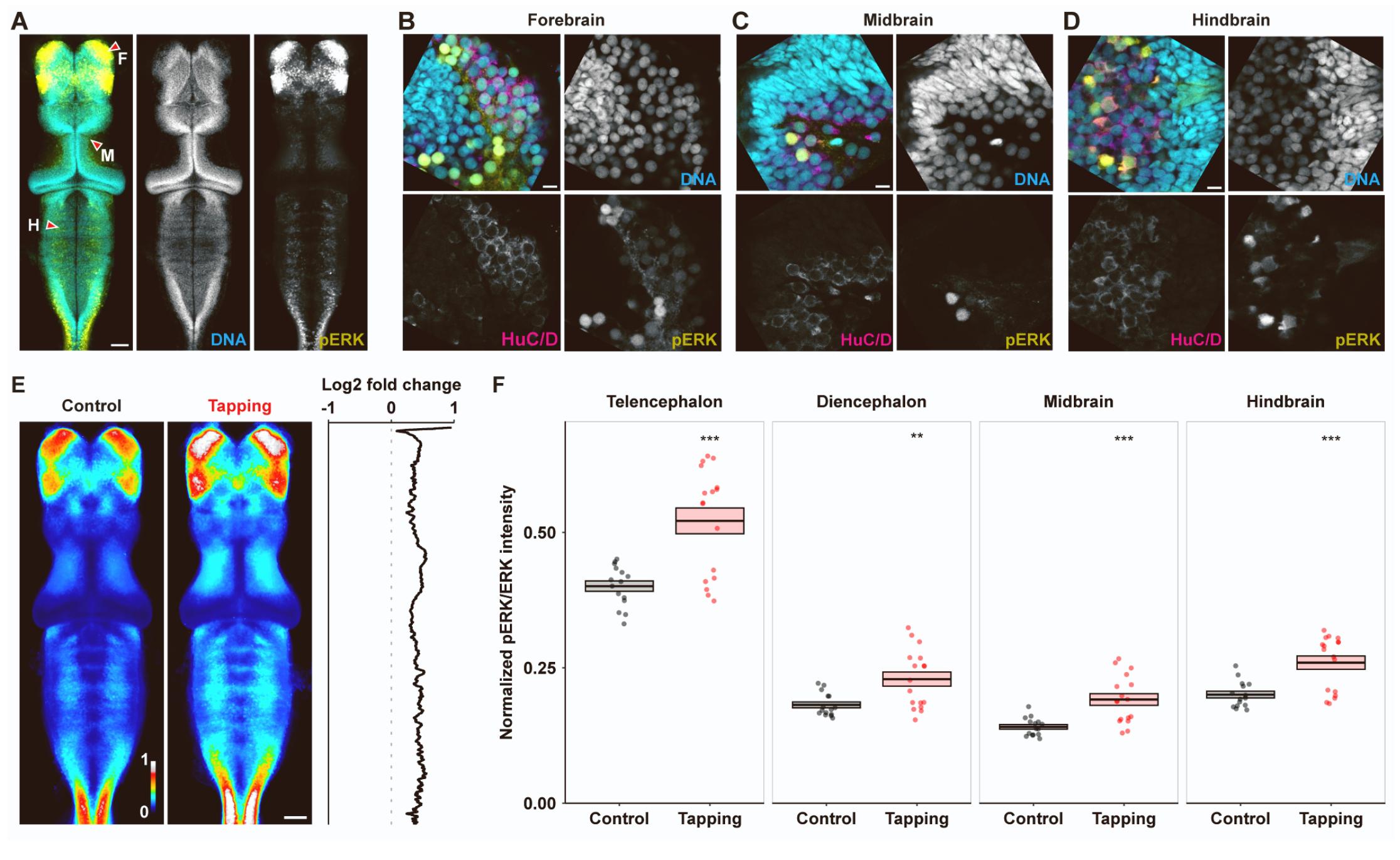 (E) Heatmap showing normalized, averaged pERK/ERK intensity of 15 control brains and 17 brains of tadpoles after 15 min of dish tapping. Stage 46 diploid tadpoles from 3 independent clutches were used. Log2 fold changes (tapping/control) of pERK/ERK intensity along Y axis are plotted to the right. Scale bar, 100[[micrometers]].