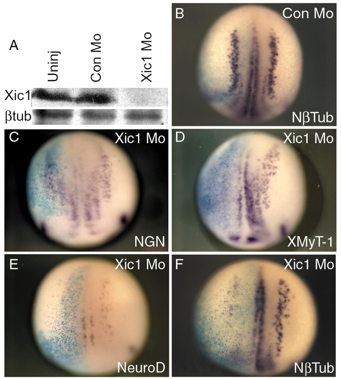 Fig. 2. Embryos depleted of p27Xic1 protein fail to produce differentiated primary neurones. (A) Western blot for endogenous p27Xic1 protein levels on stage 18 embryos that were injected with 20 ng Con Mo or p27Xic1 Mo. Cytoskeletal-β-tubulin demonstrates equal loading. Con Mo injection has no effect on any of the neural markers examined (B, data not shown). (C-F) p27Xic1 Mo-injected embryos were analysed for expression of X-NGNR-1, XMyT-1, NeuroD and Nβtub (purple) by whole-mount in situ hybridisation, injected side towards the left (β-gal, light blue). Injection of 20 ng p27Xic1 Mo has no effect on X-NGNR-1 (C) but ablates XMyT-1 (D), NeuroD (E) and Nβtub (F) expression.