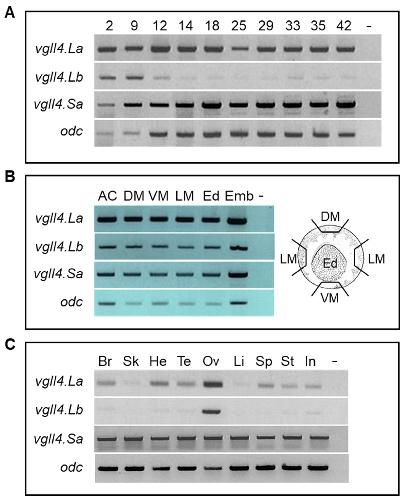 Figure 1. Temporal and spatial expression of Xenopus laevis vgll4 genes. Vgll4.La, vgll4.Lb and vgll4.Sa mRNAs were analyzed by RT–PCR with specific primers. (A) RT–PCR analysis of embryos from stage 2 to stage 42. (B) RT–PCR analysis of dissected parts of stage 11 embryos. AC, animal cap; DM, dorsal mesoderm; Ed, endoderm; Emb, total stage 11 embryo; VM, ventral mesoderm. (C) RT–PCR analysis of adult tissues. Br, brain; He, heart; In, intestine; Li, liver; Sk, skeletal muscle; Ov, ovary; Sp, spleen; St, stomach; Te, testis. Ornithine decarboxylase (odc) gene expression was used as a control—Control without reverse transcription. |