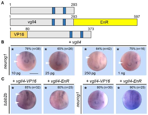 Figure 4. Overexpression of vgll4 blocks neurogenesis. (A) Schematic of the vgll4 fusion constructs. The vgll4 sequence is in gray, with TDU domains in blue. The sizes of the proteins, amino acids and different domains are indicated. EnR, repressor domain; VP16, activator domain. (B) Embryos were injected into one cell at the two-cell stage with increasing concentrations of vgll4 mRNA as indicated and analyzed via in situ hybridization for neurog1 expression. (C) Embryos were injected into one cell of a two-cell stage embryo with a constitutively active (VP16) or repressive form (EnR) of vgll4 and analyzed via in situ hybridization for tubb2b and neurog1 expression. A dorsoanterior view of neurula embryos is shown. The injected side is indicated by an asterisk. Scale bar, 500 µm. Reduced gene expression is indicated by a white arrowhead. The quantification of the results is shown inside the panels. In (B,C), the phenotype is fully penetrant. |
