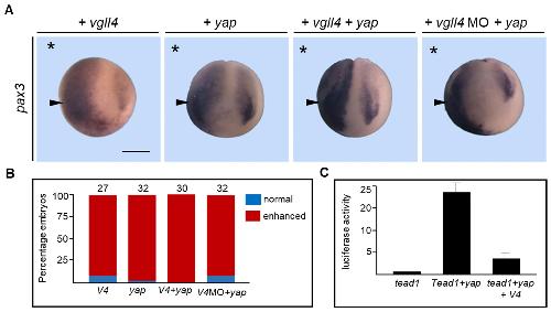 Figure 10. Vgll4 activity is both dependent and independent of YAP. (A) Embryos were injected into one cell at the two-cell stage embryo with vgll4 (V4), yap mRNA or vgll4 MO (V4MO) and analyzed at the early neurula stage via in situ hybridization for pax3 expression. A dorsoanterior view of neurula embryos is shown. The injected side is indicated by an asterisk. Scale bar, 500 µm. Enhanced gene expression is indicated by a black arrowhead. (B) Quantification of the results. The numbers on the top of each bar indicate the number of embryos analyzed from three independent experiments. (C) Embryos were injected into two cells at the two-cell stage with pGL284LUC and pRL-TK DNA with the indicated mRNAs. Animal cap explants were removed at the blastula stage, and their luciferase activity was tested. Relative firefly luciferase activity (RLU) was normalized to Renilla luciferase activity. The data are presented as the means +/- s.e.m.s from three independent experiments carried out in duplicate. * p < 0.05; Student’s t-test. |
