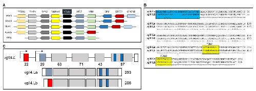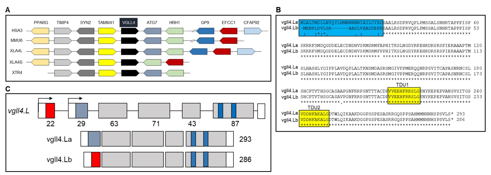 laevis version 9.1. The drawing is not on scale to avoid complexity. (B) Deduced amino acid sequence comparison between the vgll4.La and vgll4.Lb proteins. Distinct N-terminal sequences are boxed in blue and TDU domains are boxed in yellow. Identical and conserved