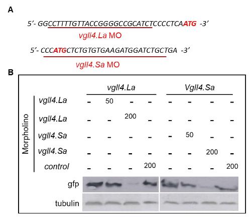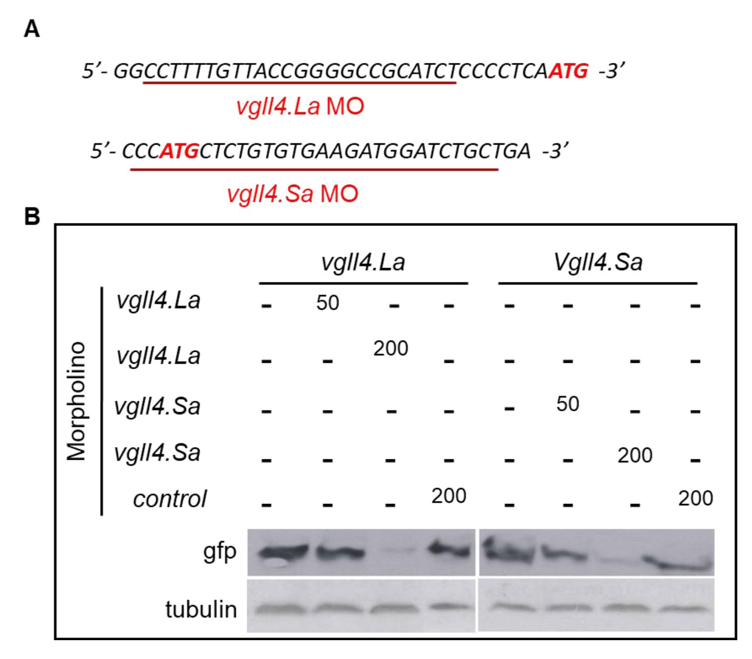 Figure S2. (A) Vgll4 translation-blocking morpholinos target vgll4.La and vgll4.Sa. The position of the MO with respect to the 5’ sequence of the mRNA is indicated by a red line. (B) Western blot analysis with anti-GFP using lysates from embryos injected with 50 or 200 pg of