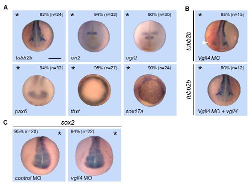 experiments were analysed, and the quantification of the results is shown in the panels. (C) Embryos were injected into one cell of a two-cell-stage embryo with the control MO, or vgll4 MO, and analyzed by in situ hybridization for sox2 gene expression. |