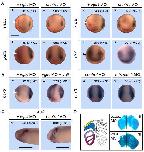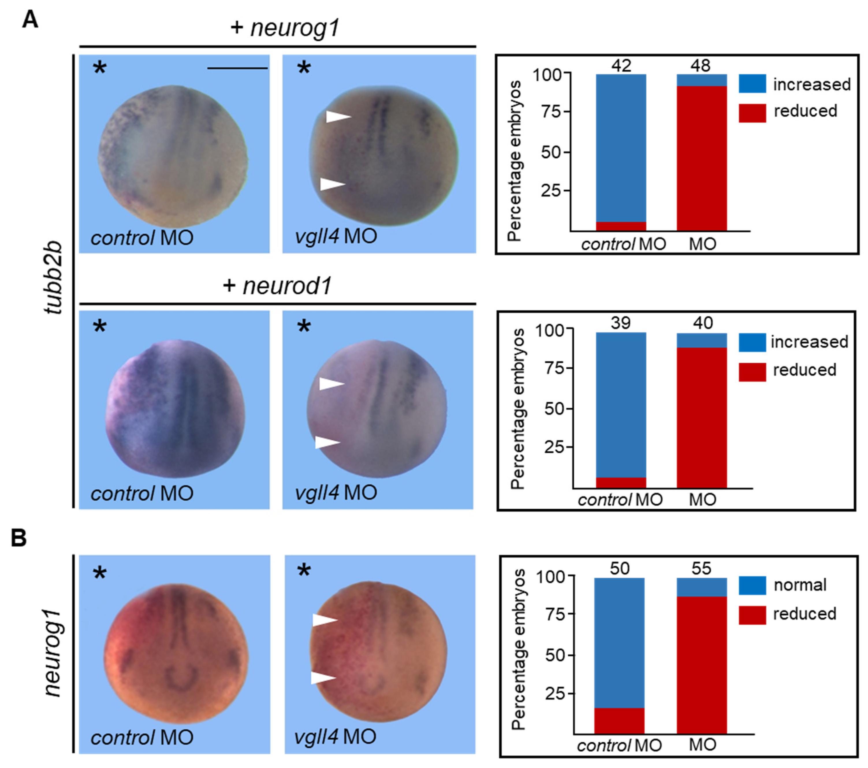 Figure 2. Vgll4 knockdown alters neural differentiation. Embryos were injected into one blastomere of 2-cell-stage embryos with 10 ng of vgll4 MO and analyzed by in situ hybridization for gene expression, as indicated in the panel. mRNA encoding the lineage tracer ß-galactosidase was co-injected with the MOs to identify the injected side. The asterisk indicates the injected side. Scale bar, 500 µm. A dorsoanterior view of neurula embryos is shown. A ventral view of gastrula embryos is shown for tbxt and sox17a. Reduced gene expression is indicated by a white arrowhead. Results are shown in adjacent panels. The numbers on the top of each bar indicate the number of embryos analyzed from three independent experiments. [[ Abbreviations: MO = morpholino ]] |
