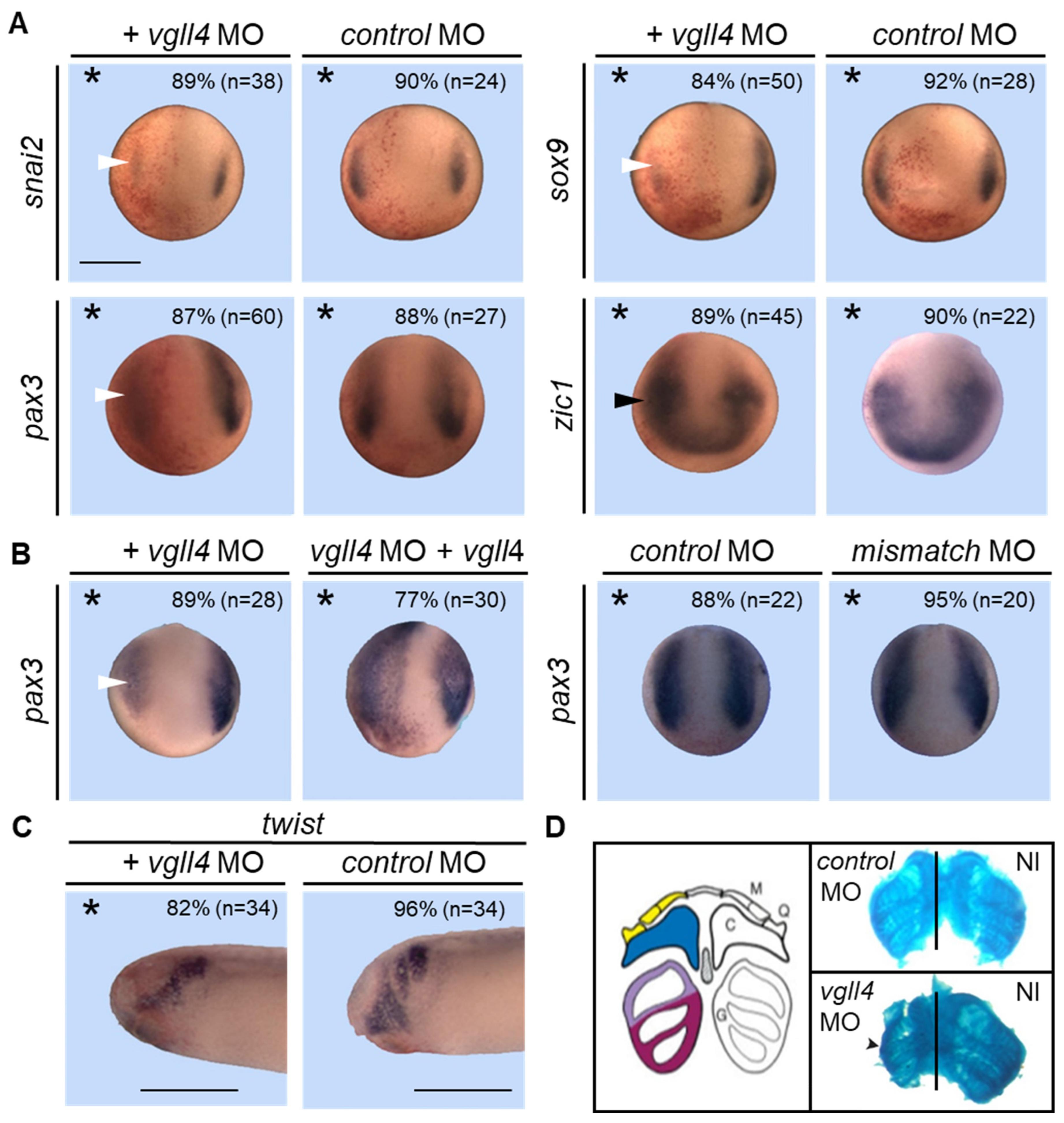 Figure 6. Vgll4 is required for neural crest formation and normal craniofacial development. (A) Embryos were injected into one cell at the two-cell stage embryo with vgll4 MO or control MO and analyzed at the early neurula stage via in situ hybridization for the expression of the indicated genes. (B) Embryos were injected into one cell at the two-cell stage embryo with vgll4 MO alone or with vgll4 mRNA (vgll4) and analyzed at the neurula stage via in situ hybridization for pax3 expression. Reduced gene expression is indicated by a white arrowhead and increased expression is indicated by a black arrowhead. Control MO or a mismatch MO were tested under the same conditions. A dorsoanterior view of the embryos is shown. The injected side is indicated by an asterisk. Scale bar, 500 µm. Three independent experiments were analyzed and the quantification of the results is shown inside the panels. (C) Embryos were injected into one cell of a two-cell-stage embryo with the vgll4 MO or control MO and analyzed at the tailbud stage via in situ hybridization for twist expression. A lateral view of the embryo is shown. The injected side is indicated by an asterisk. Scale bar, 500 µm. The quantification of the results is shown inside the panels. (D) Alcian blue staining of dissected craniofacial cartilage from vgll4 MO- or control MO-injected tadpoles at stage 45. The left panel is a diagram illustrating Meckel’s (M), palatoquadrate (Q), ceratohyal (C) and gill (G) cartilage. The black lines indicate the midline. [[ Abbreviations: MO = morpholino ]] |