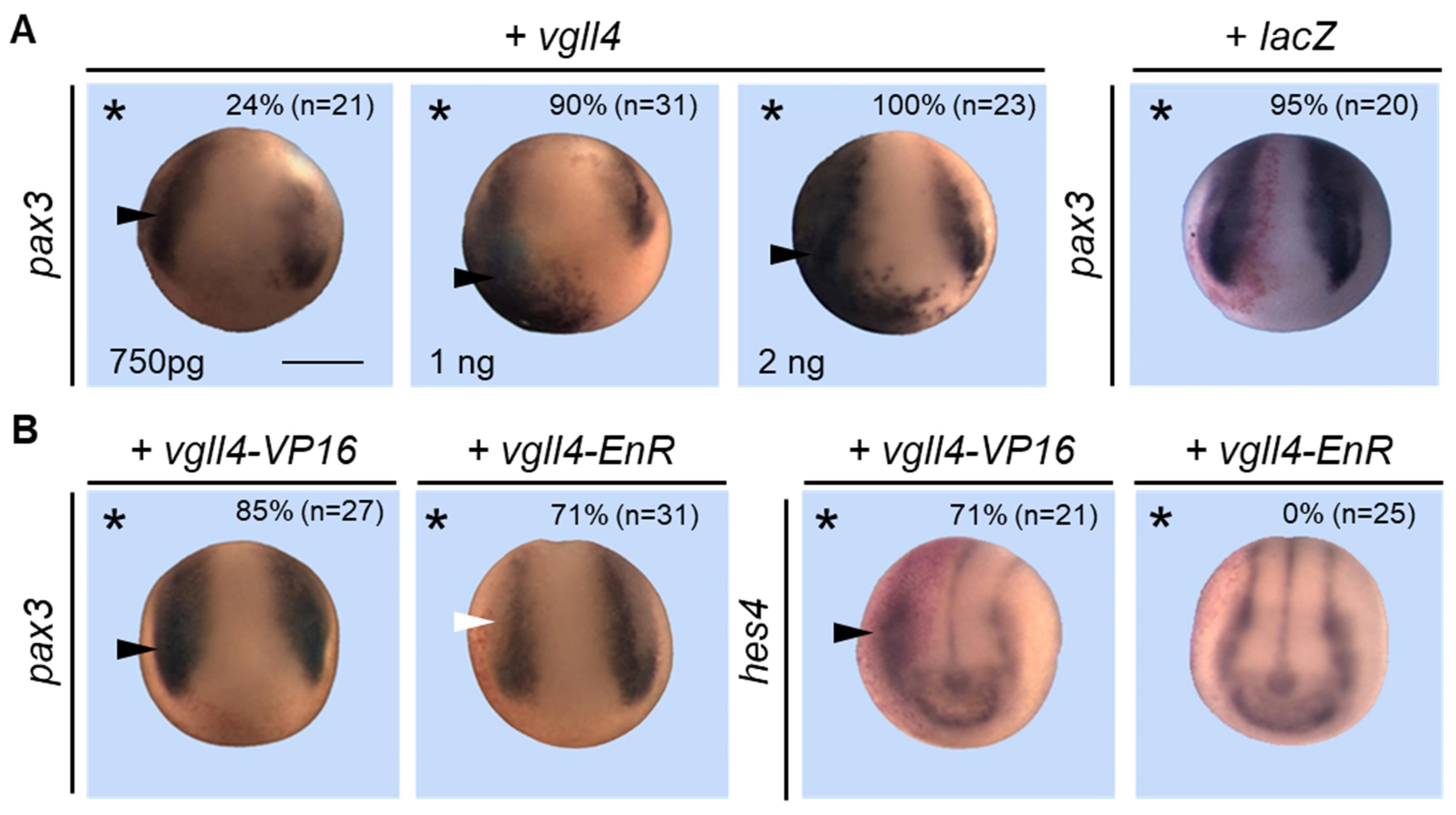 Figure 7. Vgll4 overexpression stimulates neural crest development. (A) Embryos were injected into one cell at the two-cell stage embryo with vgll4 mRNA as indicated and analyzed at the early neurula stage via in situ hybridization for pax3 expression. β-gal mRNA (lacZ) was injected as a control. (B) Embryos were injected into one cell at the two-cell stage embryo with vgll4-VP16 or vgll4-EnR mRNA and analyzed at the neurula stage via in situ hybridization for pax3 and hes4 expression. Increased or decreased gene expression is indicated by a black or white arrowhead, respectively. A dorsoanterior view of the embryos is shown. The injected side is indicated by an asterisk. Scale bar, 500 µm. Three independent experiments were analyzed and the quantification of the results is shown inside the panels. [[ Abbreviations: MO = morpholino ]] |