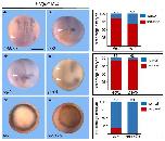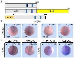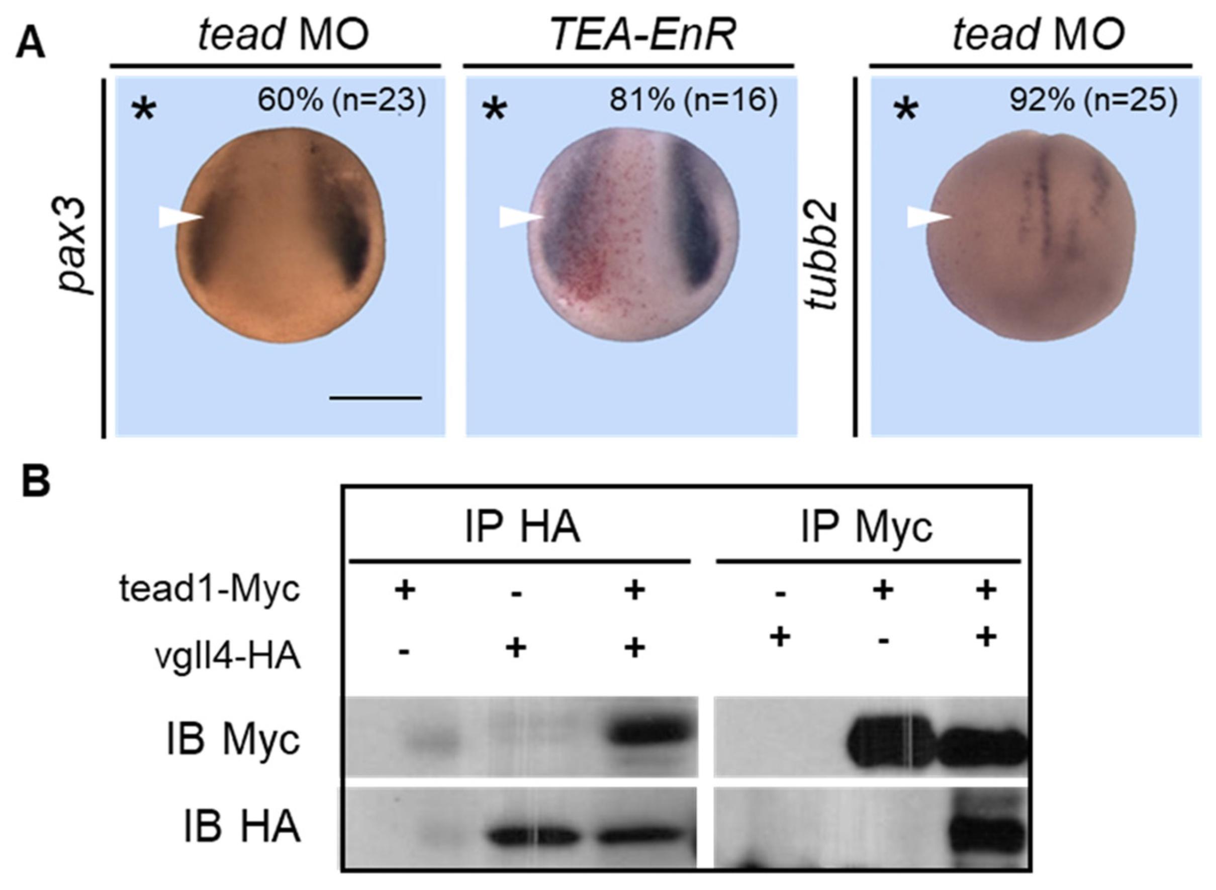 Figure 8. TEAD morphant embryos phenocopy vgll4 morphants. (A) Embryos were injected into one cell of a two-cell-stage embryo with tead MO or TEA-EnR mRNA as indicated and analyzed at the early neurula stage via in situ hybridization for pax3 or tubb2 expression. Reduced gene expression is indicated by a white arrowhead. A dorsoanterior view of neurula embryos is shown. The injected side is indicated by an asterisk. Scale bar, 500 um. Three independent experiments were analyzed and the quantification of the results is shown inside the panels. (B) Embryos were injected into two-cell embryos at the two-cell stage with tead1-Myc alone or in combination with vgll4-HA mRNA as indicated and subjected to immunoprecipitation (IP) followed by immunoblotting (IB) with anti-Myc or anti-HA antibodies. [[ Abbreviations: MO = morpholino ]] |