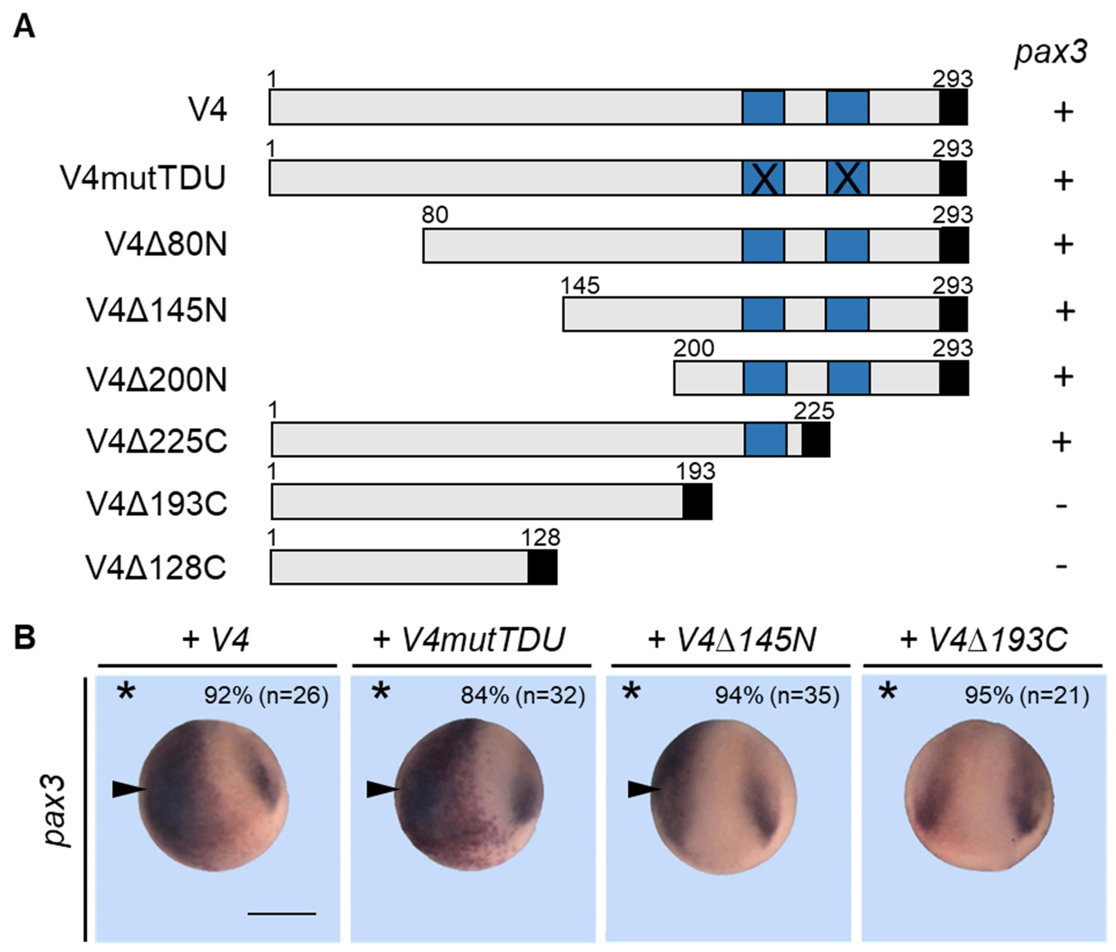 Figure 9. Vgll4 can bypass this interaction to activate pax3. (A) Schematic of the vgll4 (V4) fusion constructs. The sizes of the proteins with deleted regions (Δ) are indicated. The C-terminal HA tag and TDU domains are shown in black and blue boxes, respectively. In the V4mutTDU construct, both TDU domains are mutated (X). In situ hybridization of pax3 expression in embryos injected with the different constructs is indicated on the right (+/−). (B) Embryos were injected into one cell at the two-cell stage embryo with the indicated vgll4 construct mRNA and analyzed at the early neurula stage via in situ hybridization for pax3 expression. A dorsoanterior view of neurula embryos is shown. The injected side is indicated by an asterisk. Scale bar, 500 µm. Increased pax3 expression is indicated by a black arrowhead. Three independent experiments were analyzed, and the quantification of the results is shown inside the panels. |