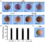 Figure 5. Proliferation and apoptosis are unchanged in vgll4-depleted embryos. (A) Embryos were injected into one cell at the two-cell stage embryo with control MO or vgll4 MO and analyzed at the blastula stage by immunostaining to detect phosphohistone (pHH3). (B) Embryos were injected into one cell at the two-cell stage embryo with control MO or vgll4 MO and analyzed at the neurula stage by in situ hybridization for p27xic expression and by TUNEL assay. The dorsoanterior view is shown. The injected side is indicated by an asterisk. Scale bar, 500 um. Three independent experiments were analyzed and the quantification of the results is shown inside the panels. (C) Quantification of phosphohistone (pHH3). (D) Non-injected embryo analyzed by TUNEL staining. [[ Abbreviations: MO = morpholino ]] |